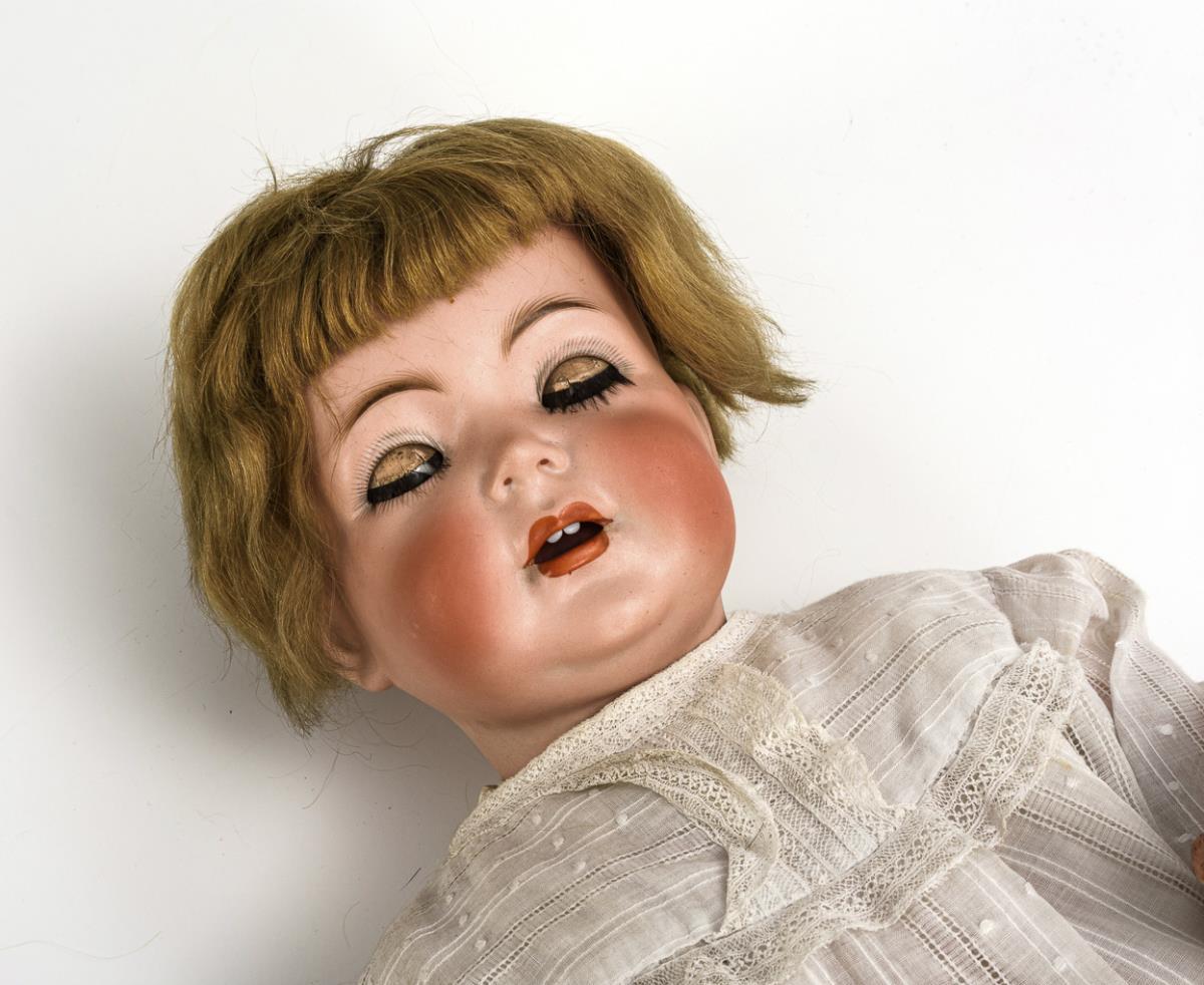 Kurbelkopf, blaue Schlafaugen, Wimpern, blonde Mohairperücke. 5-teiliger Sitzbabykörper. Weißes Kleid, schwarz-weiße Lederschuhe. Kopf durchleuchtet: ohne Defekte. Körper mit Übermalungen.
