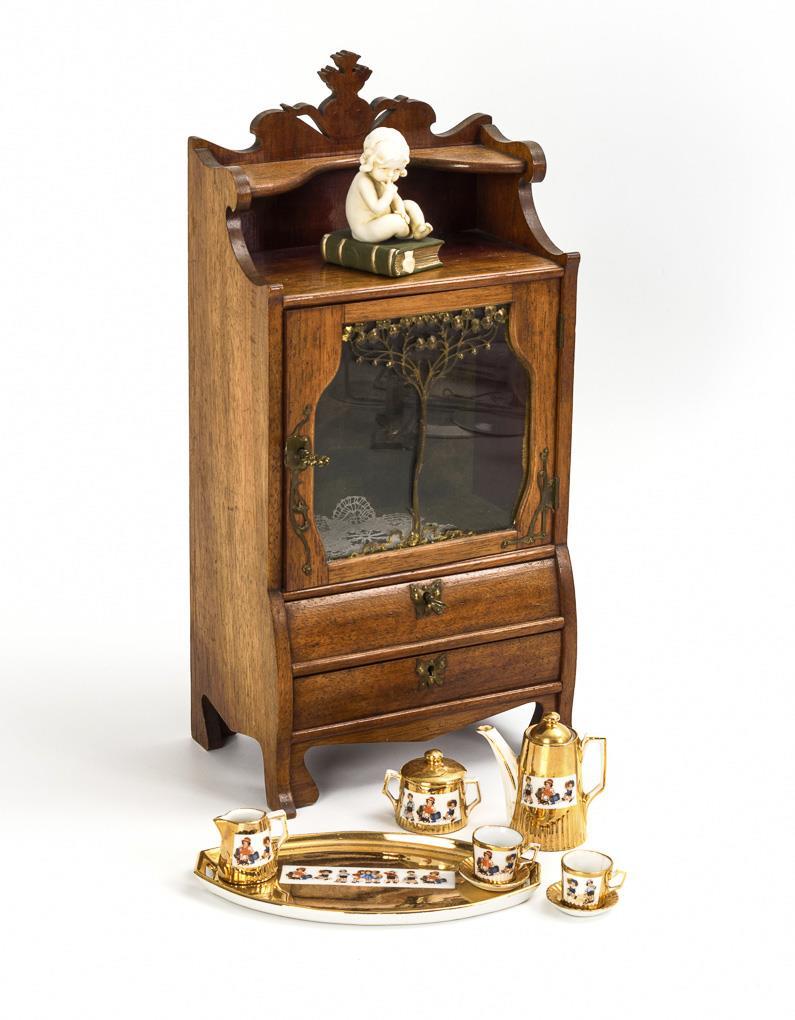 Jugendstil-Puppenschrank, Goldservice und kleine Nippesfigur.