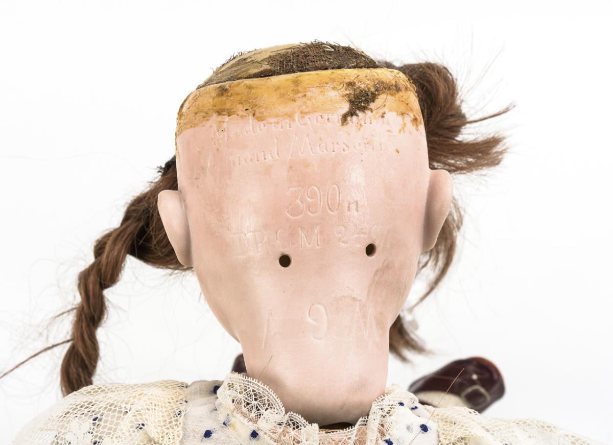 Puppenmädchen (AM 390n) mit Kurbelkopf, braunen Glasaugen, Wimpern, hellbrauner Echthaarperücke mit Zöpfen, 15-teiligem Gliederkörper und weißem Kleid mit blauen Punkten. Kleine Chips an der Halskurbel, linker Fuß mit provisorischer Reparatur, L 63 cm. / Blondes Charakterbaby (Heubach Köppelsdorf 302) mit Kurbelkopf, blauen Schlafaugen, Mohairperücke, 5-teiligem Sitzbabykörper mit Stimme. Weißes Kleid, Haube und schwarze Lackschuhe. Kopf ohne Defekte, Körper mit Übermalungen, L 39 cm.