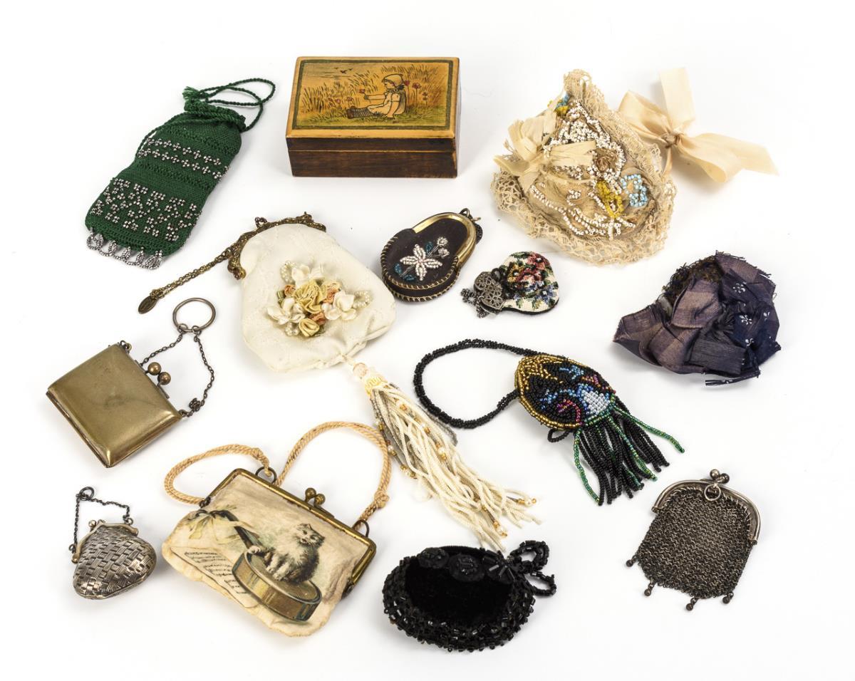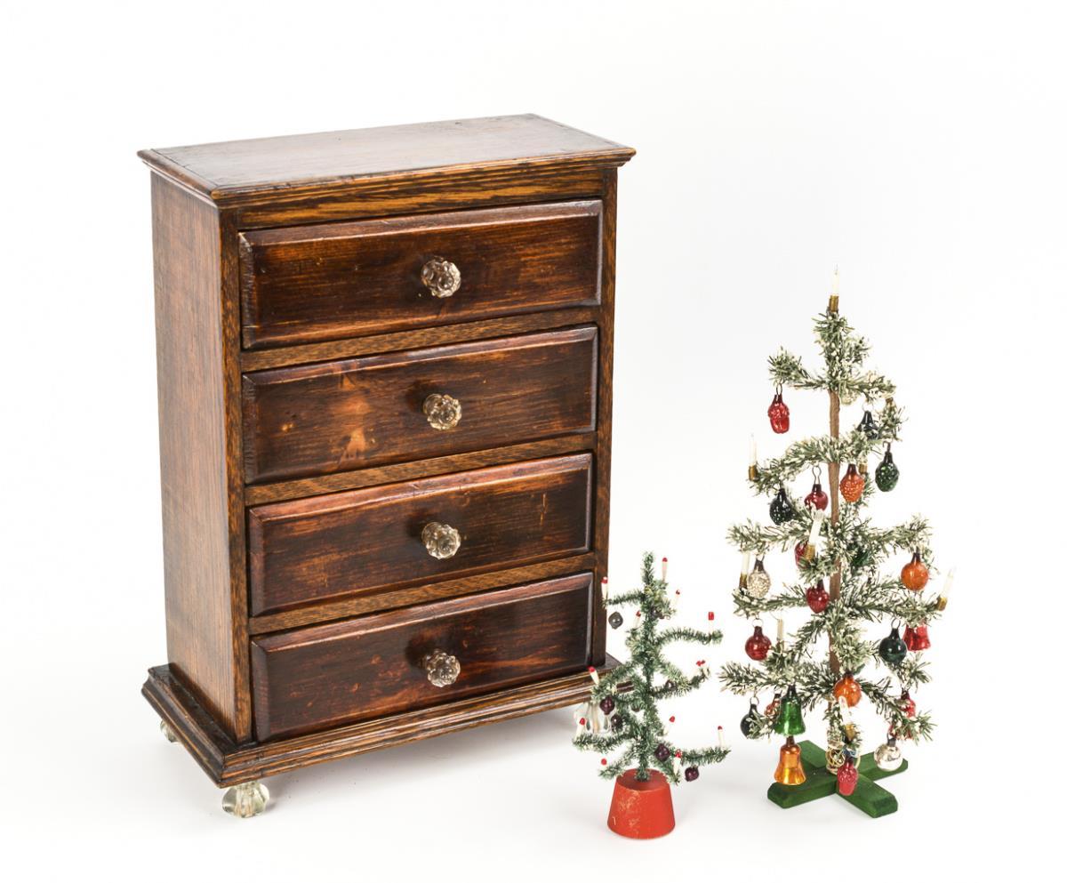 Dunkelbraun gebeizte Kommode mit Knäufen und Füßen aus Glas (40 x 28 x 14,5 cm). Dazu 2 geschmückte Weihnachtsbäumchen, verschiedene Strümpfe, Handtäschchen und 1 Hut. Teils mit Altersspuren.