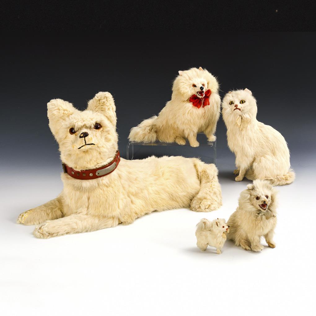Liegender Hund mit abnehmbarem Kopf und Reißverschluss an der Unterseite, zur Aufbewahrung der Nachtwäsche. 27 x 46 cm. 3 Spitz-Hunde in verschiedenen Größen (H 7, 14, 19 cm). Sitzende Katze mit grünen Glasaugen (H 22 cm). Teils mit Fellverlust.