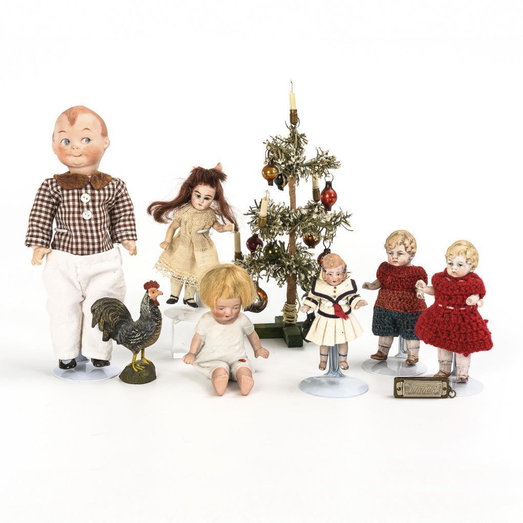 Charakterpüppchen mit gemalten Schielaugen, sitzende Biskuitfigur mit modelliertem Marienkäfer auf dem Bein, 3 Püppchen mit modellierten Haaren, 1 Püppchen mit Mohairperücke. Dazu geschmücktes Weihnachtsbäumchen mit teils defekten Glaskugeln, Masse-Hahn und Mundharmonika. Altersspuren, Defekte, 1 Püppchen mit fehlendem Fuß und Hand, Schielpüppchen mit Restaurierungen.