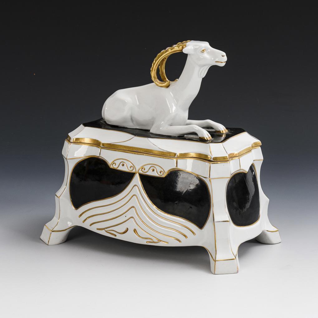 Rechteckige Dose mit vier Füßen, auf dem Deckel die plastische Figur eines liegenden Steinbockes. Partieller Goldabrieb, 1 kleine Glasurfehlstelle.