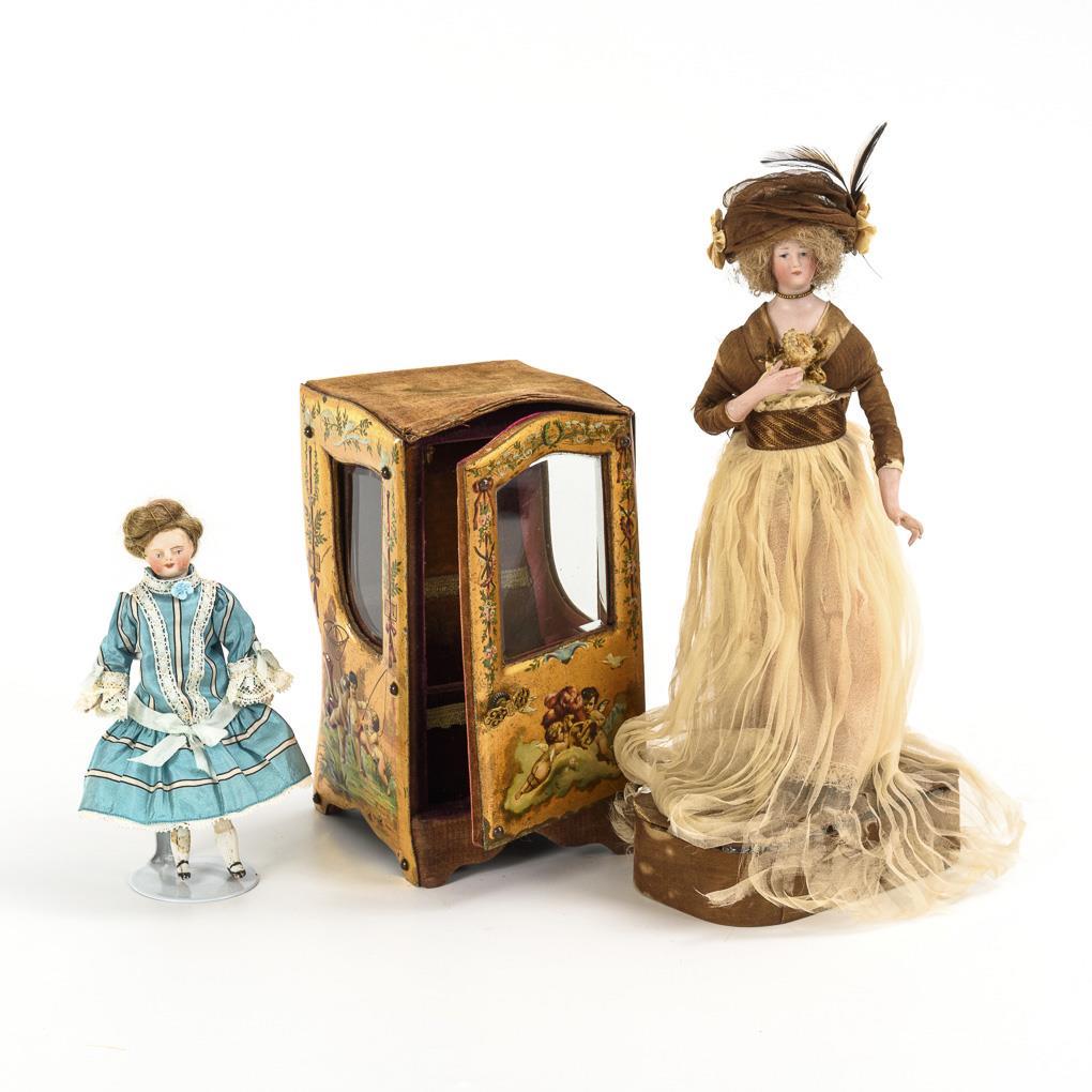 Dreiseitig verglaste Sänfte mit farbig lithografiertem Dekor auf Goldgrund, 17,5 x 9 x 10 cm. / Elegante Puppendame mit Brustkopf und Biskuitarmen, drehbar auf braunem Sockelkästchen. L 25 cm. / Kleine Brustkopfpuppe für die Puppenstube, mit blondem Haar und türkisfarbenem Kleid. 1 Bein ergänzt. L 13,5 cm. Altersspuren, kleine Defekte. Kopf der kleine Puppe lose.