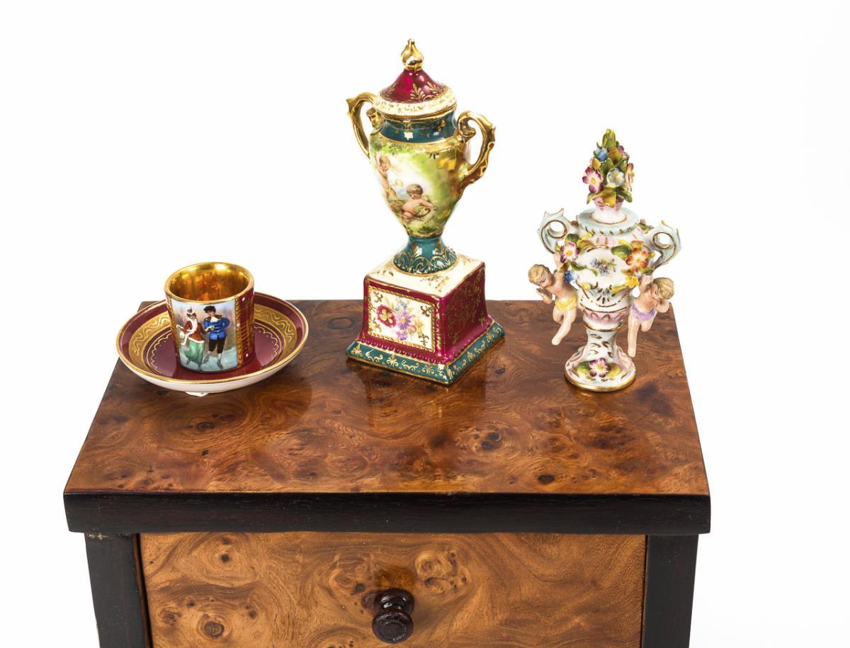 Kommode mit Maserfurnier und schwarzen Kanten (31,5 x 22 x 14,5 cm). Dazu Zierväschen sowie Tasse und Deckelvase im Wiener Stil. Teils leichte Altersspuren.
