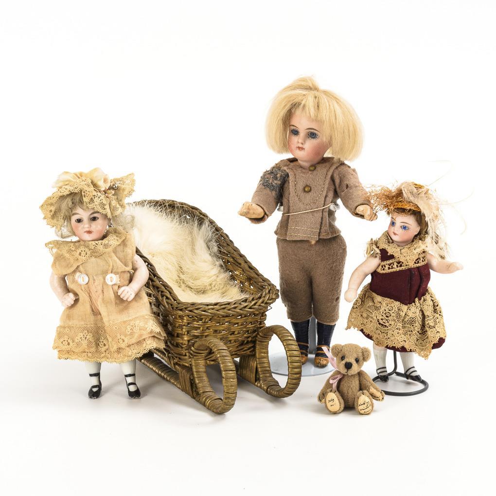 Alle Püppchen mit Glasaugen, Mohairperücke und modellierten Schuhen: blondes Püppchen in grauem Filzanzug (L 16 cm), kleine Puppe mit Strohhut (L 11 cm), Puppenmädchen in rosa Kleid (L 12 cm). Dazu jüngerer Schlitten und Teddy.