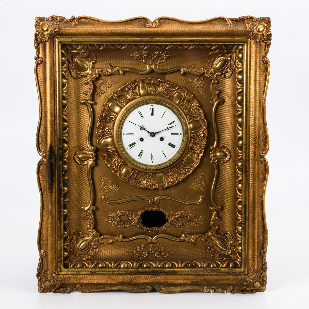 Geschnitztes und vergoldetes Holzgehäuse mit Barockornamenten, großer Zifferblattrosette und Pendelsicht. Verglaste Fronttür, verso Etikett "Hugo Maresch Uhren und Goldwaren Gotha [...]". Werk läuft. Gehäuse und Zifferblatt mit Defekten und alten Reparaturen, Ergänzungen, Altersspuren.