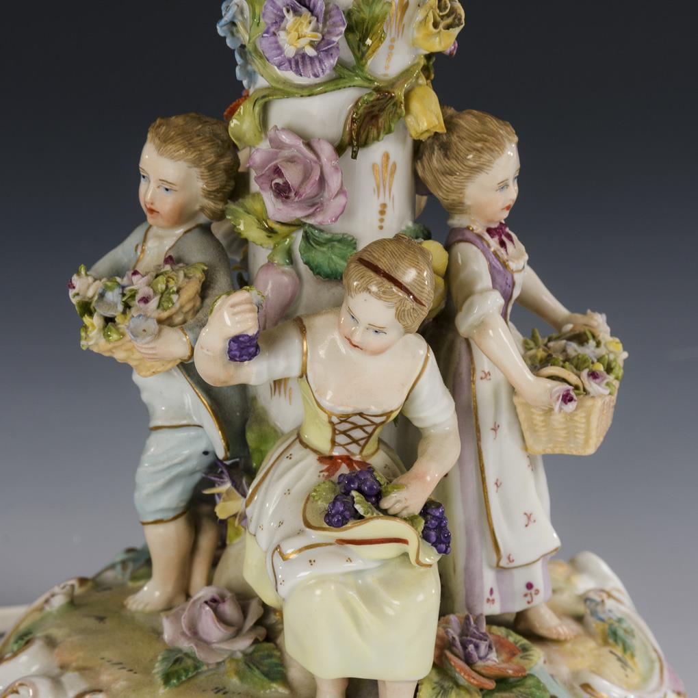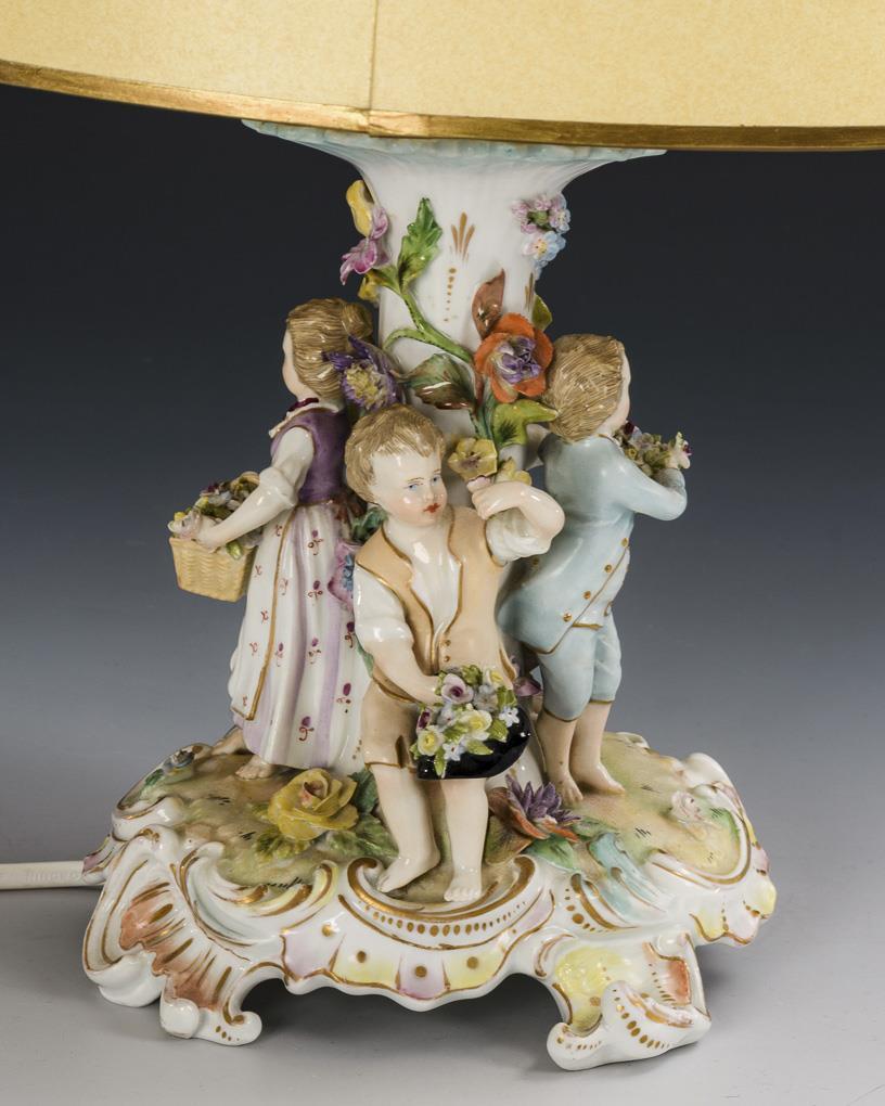 Rocaillelampenfuß mit vier um den blütenbelegten Baumstammschaft gruppierten Gärtnerkindern. Elektrifiziert (Funktion nicht geprüft), oval-konischer Schirm. Bestoßungen am Belag.