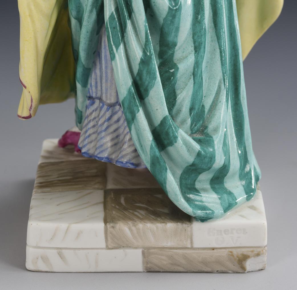 Im Tanzschritt stehende, die Schürze ausbreitende Rokokodame. 1 Sockelecke, 1 Finger und Schleifenband bestoßen.