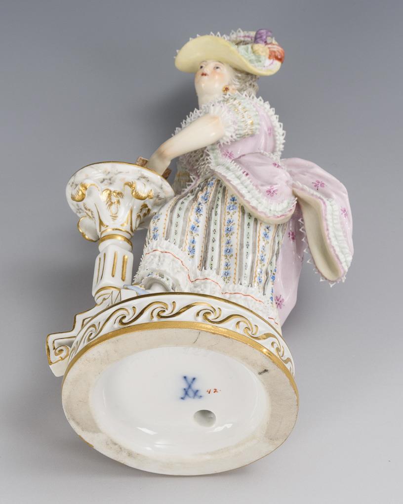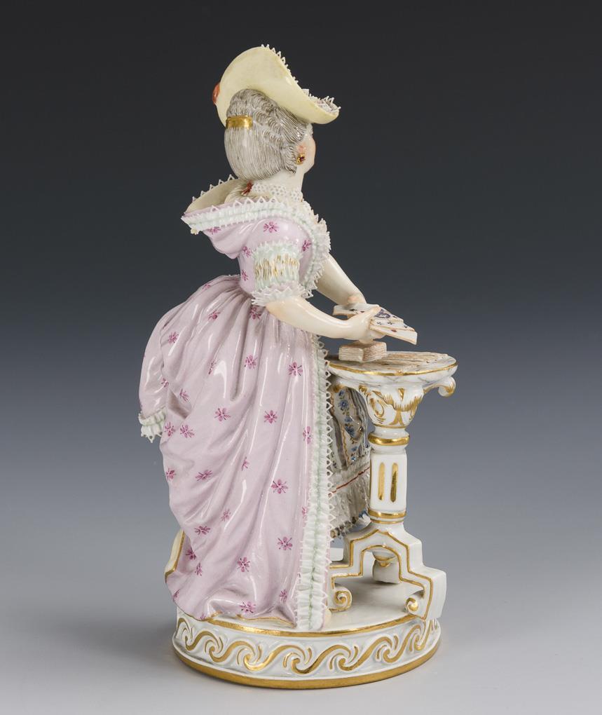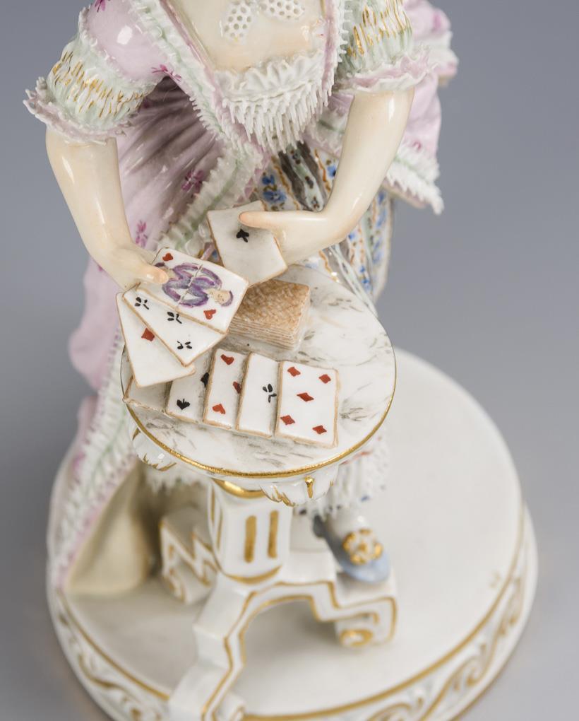 An einem Tisch stehende, die Karten legende Rokokodame.