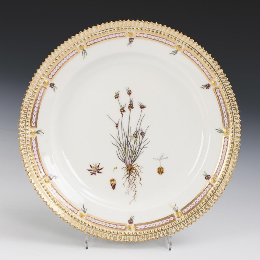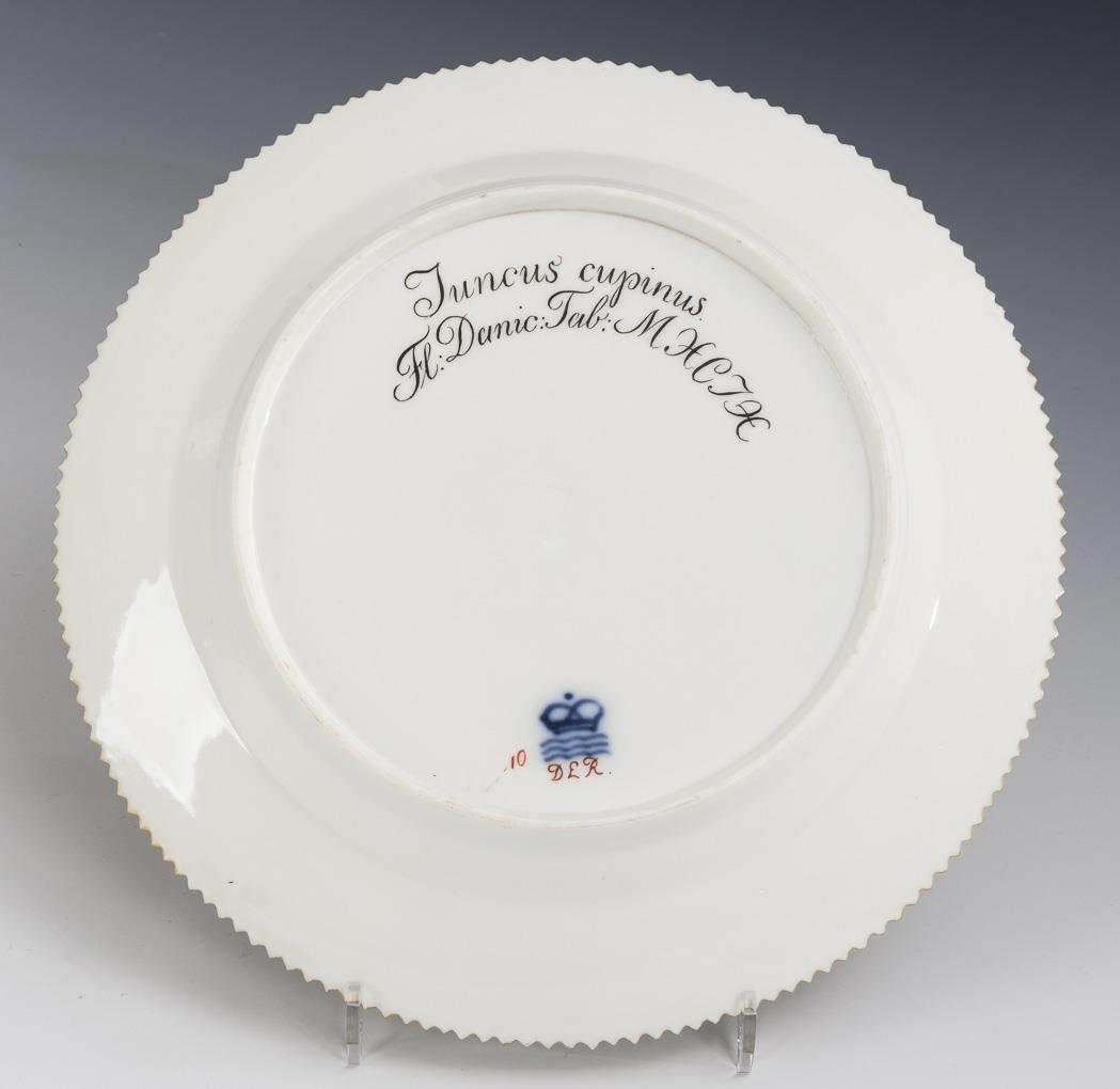 Vorspeisenteller mit gezacktem Rand, im Spiegel die Darstellung einer Platthalm-Binse, unterseitig lateinisch bezeichnet.
