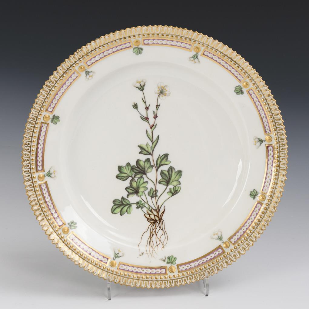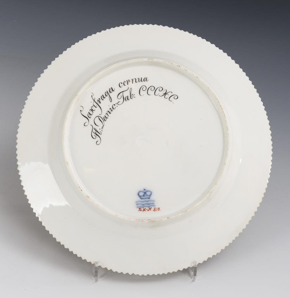 Vorspeisenteller mit gezacktem Rand. Im Spiegel die Darstellung einer Pflanze des Nickenden Steinbrechs, unterseitig lateinisch bezeichnet. 2 Zacken minimal bestoßen.
