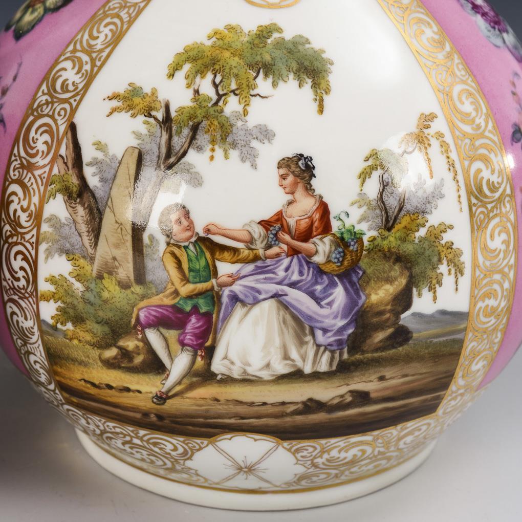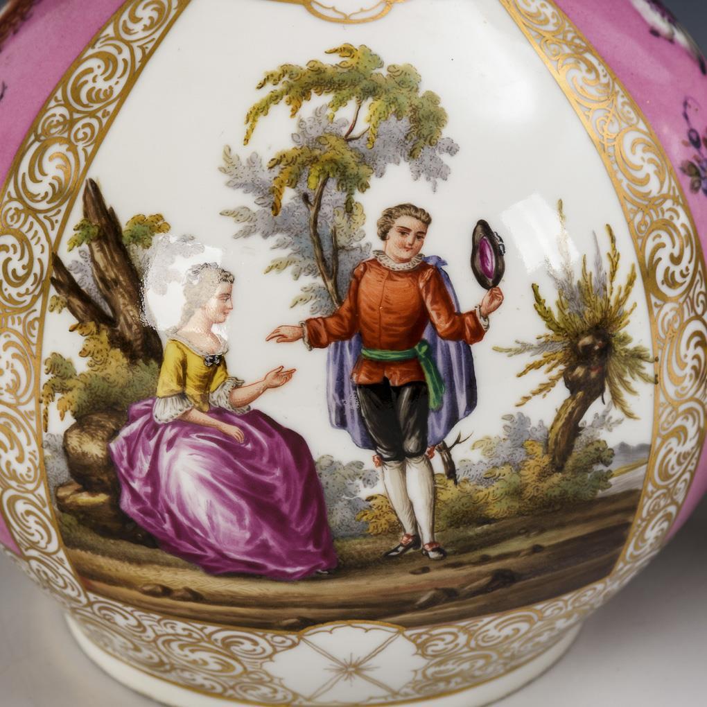 Kugelkorpus mit Enghals. Auf der Wandung alternierend angeordnete rosa Fondfelder mit Blumenbukett und Felder mit einer galanten Szene. Minimaler Goldabrieb.