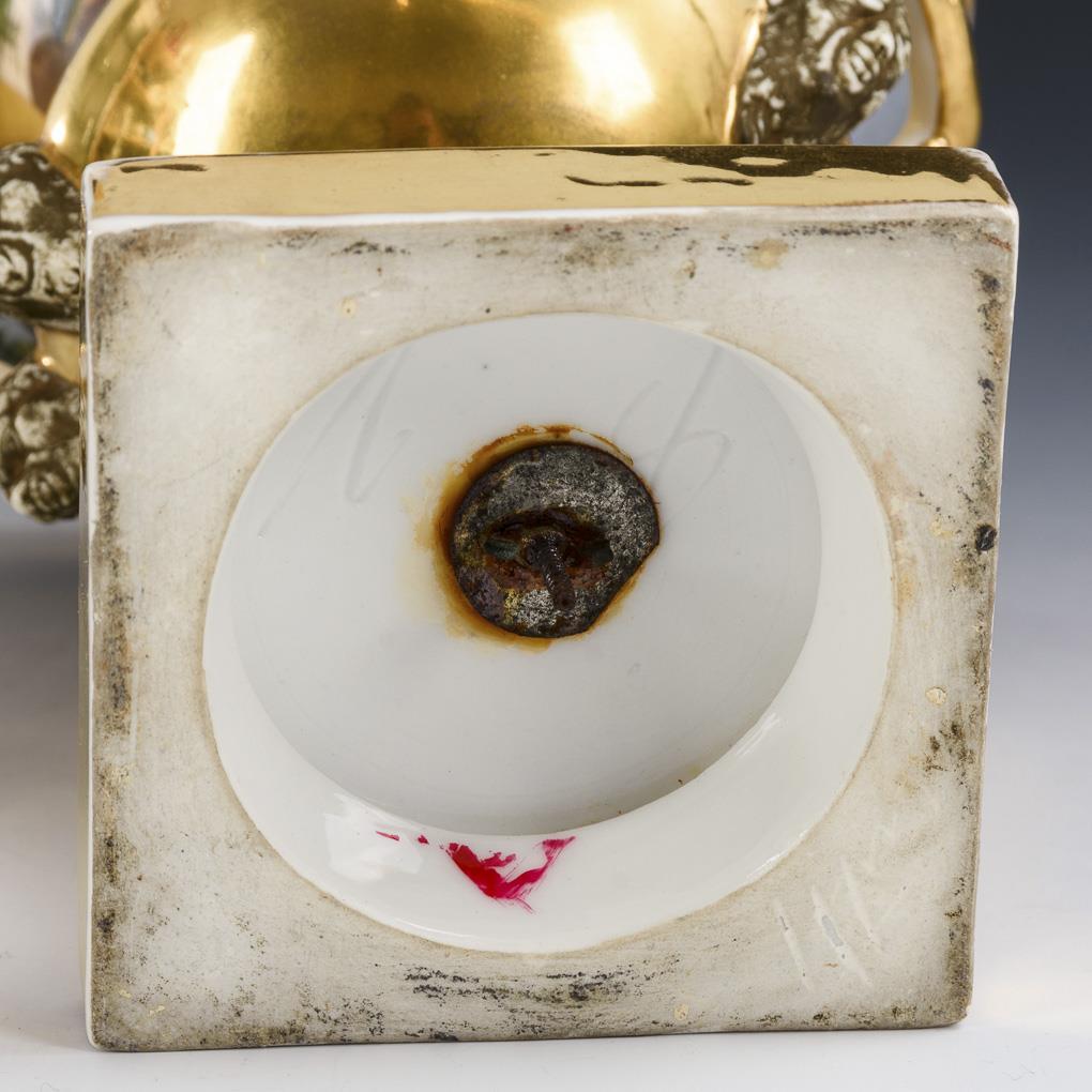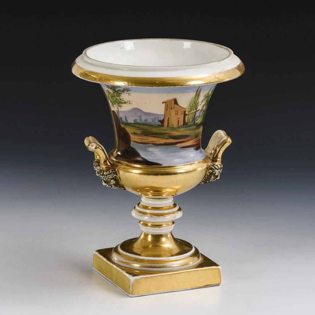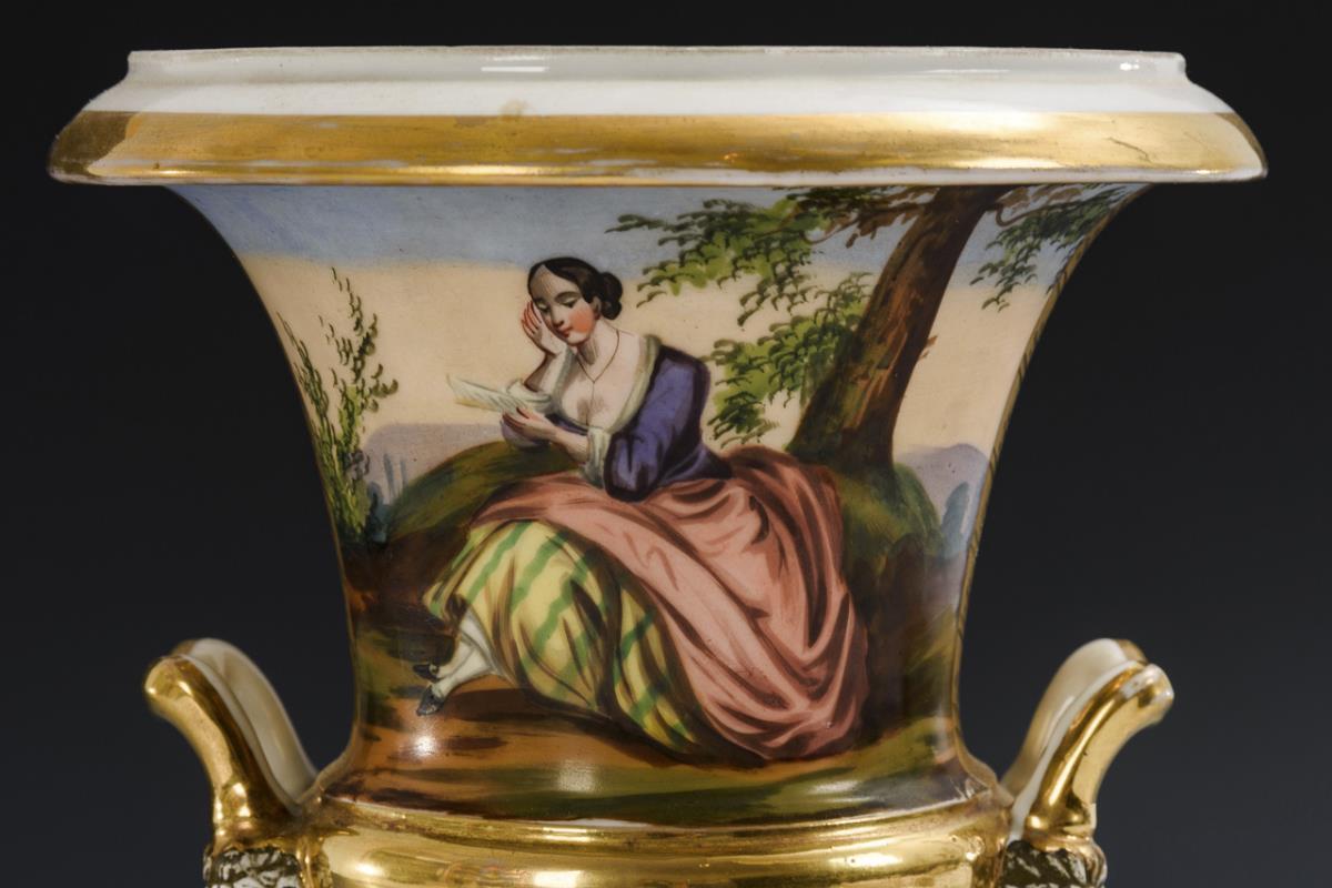 Kratervase mit zwei Maskaronhandhaben und Rundfuß, auf Quadratplinthe. Schauseitig die Darstellung einer brieflesenden Biedermeier-Dame, verso Landschaftsmalerei. Partieller Goldabrieb.