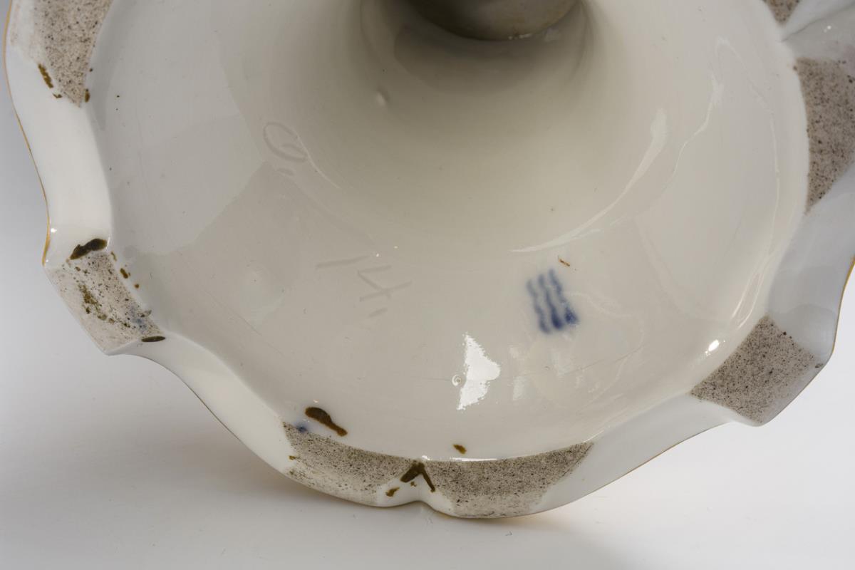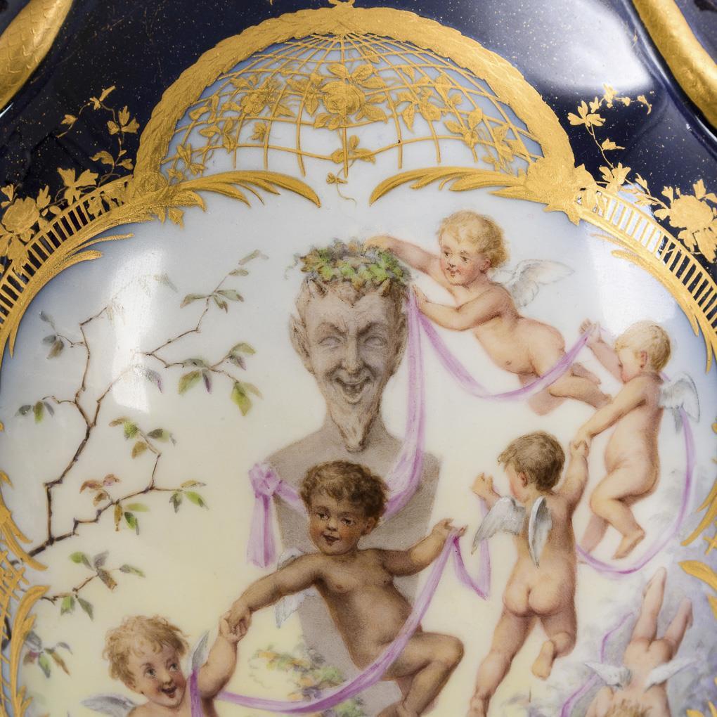 Hohe, ovoide Vase mit zwei von Schlangen flankierten Faunskopfhandhaben, durchbrochenem Hals und Rundfuß. Kobaltblauer Fond mit Goldäderung. Schauseitig eine große, von einem fein floral-ornamental goldgravierten Rahmen gefasste Kartusche mit der Darstellung eines Puttenreigens mit Faunsskulptur.