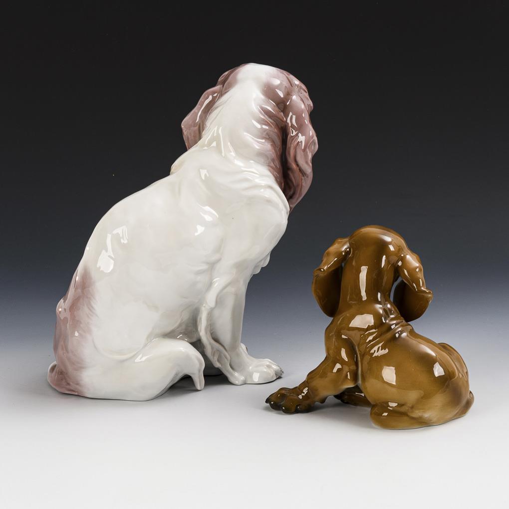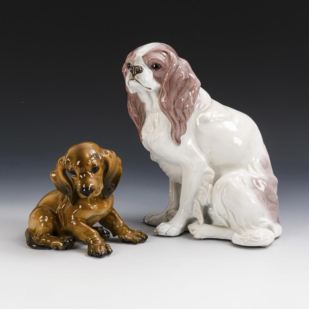 1x King Charles Spaniel, Modell-Nr. K 540, Entwurf 1919 von Dorothea Moldenhauer (1879-1968). / 1x Dackelwelpe, Modell-Nr. 1247, Entwurf 1933 von Theodor Kärner (1884-1966).