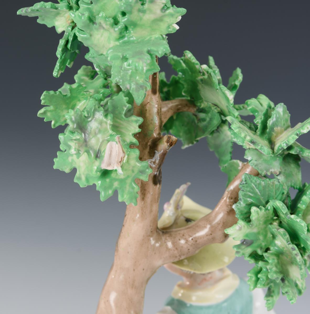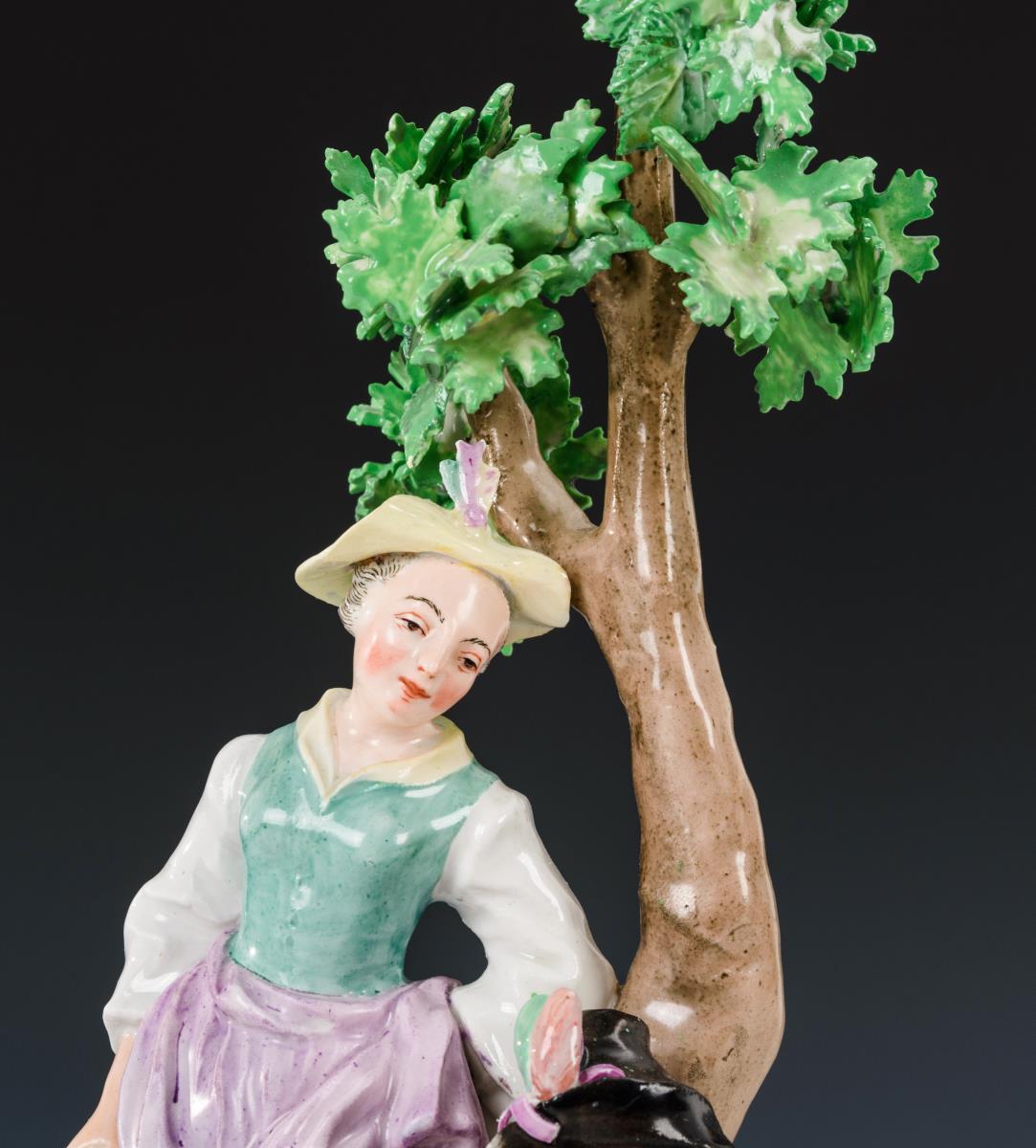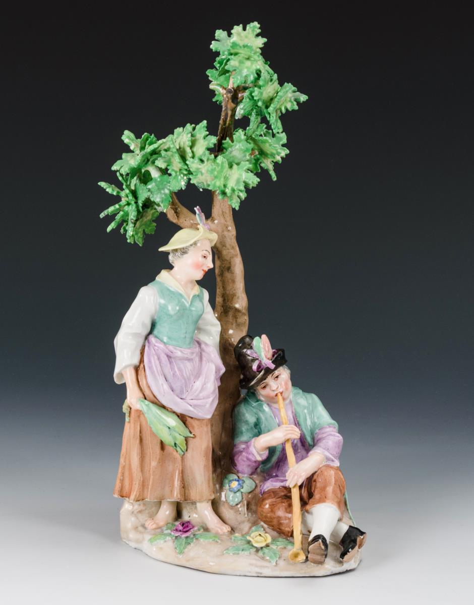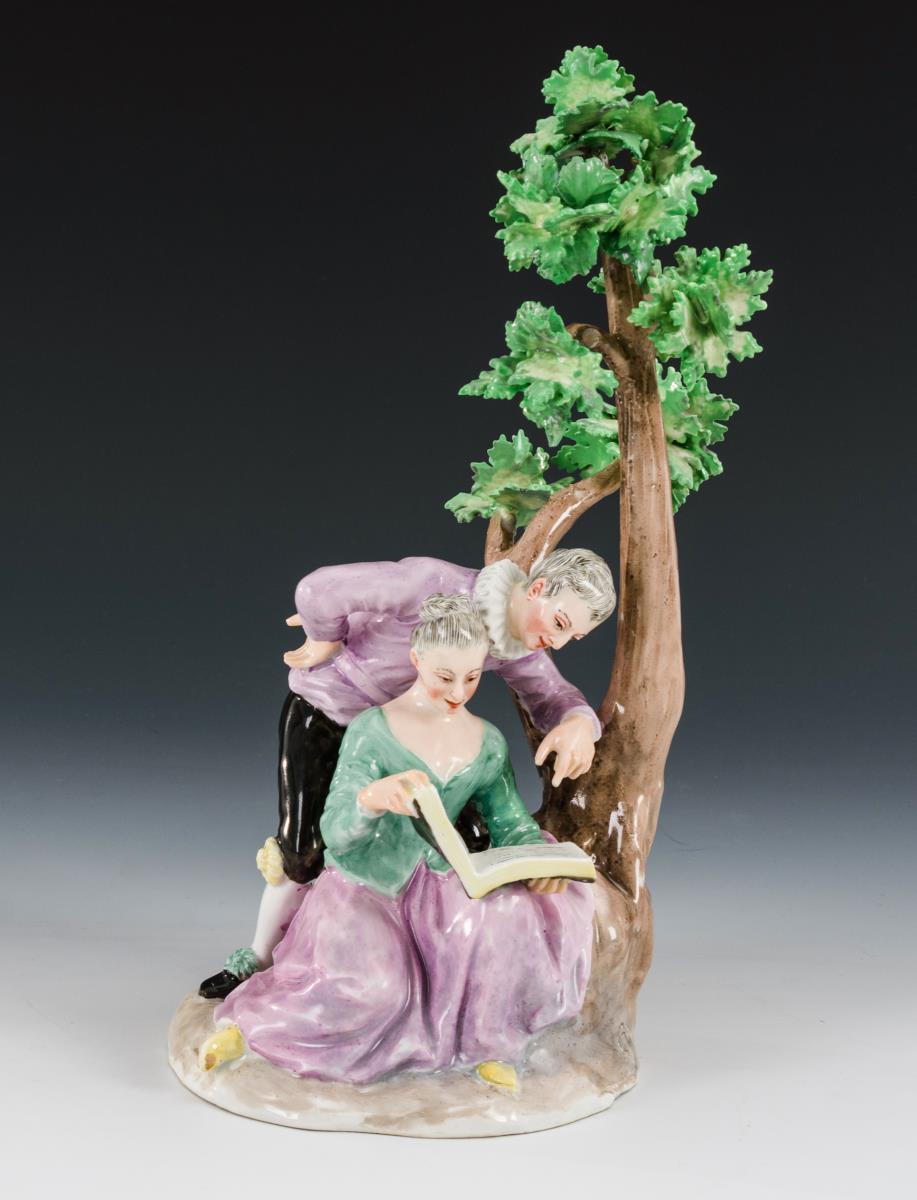 1x Bäuerin mit alphornspielendem Bauern unter einem Baum. / 1x galantes Paar mit Buch unter einem Baum. 1x Blätter lose anbei, beide restauriert, beide unterseitig mit Brandriss.