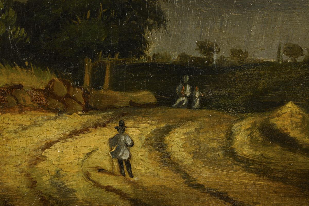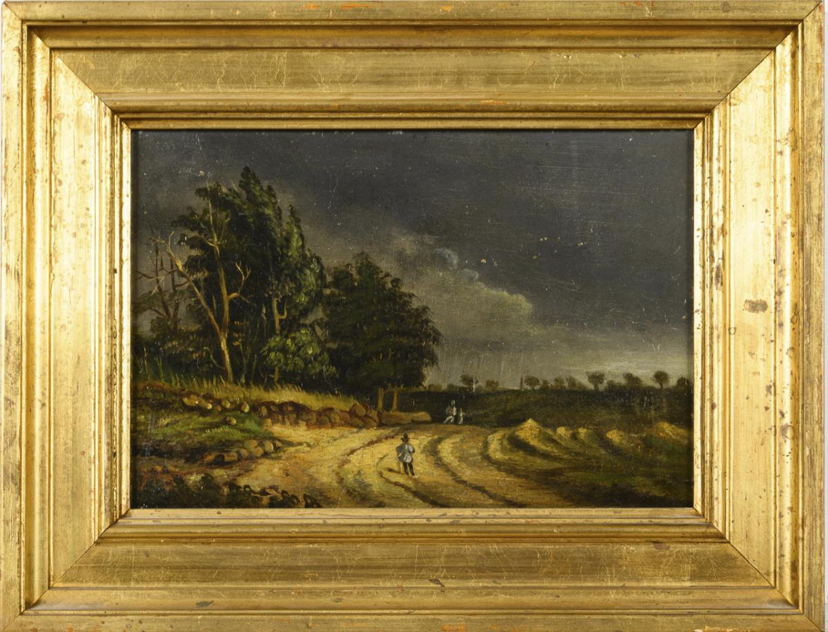 Landschaft mit hohen Bäumen und Weizenfeldern sowie Figurenstaffage. Altersspuren.