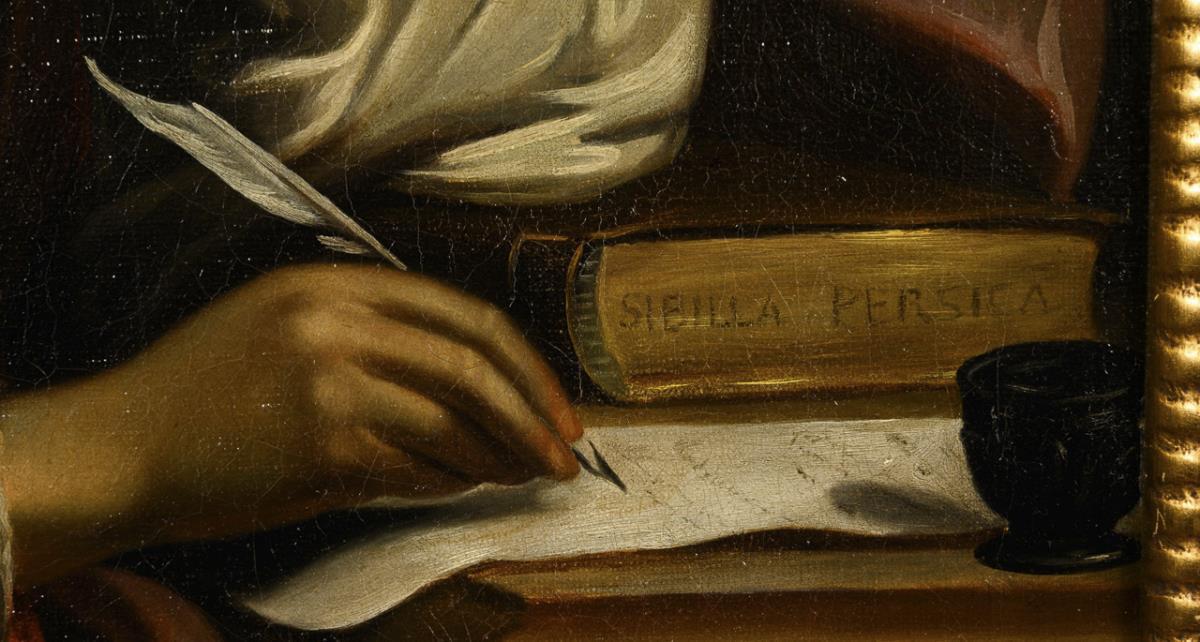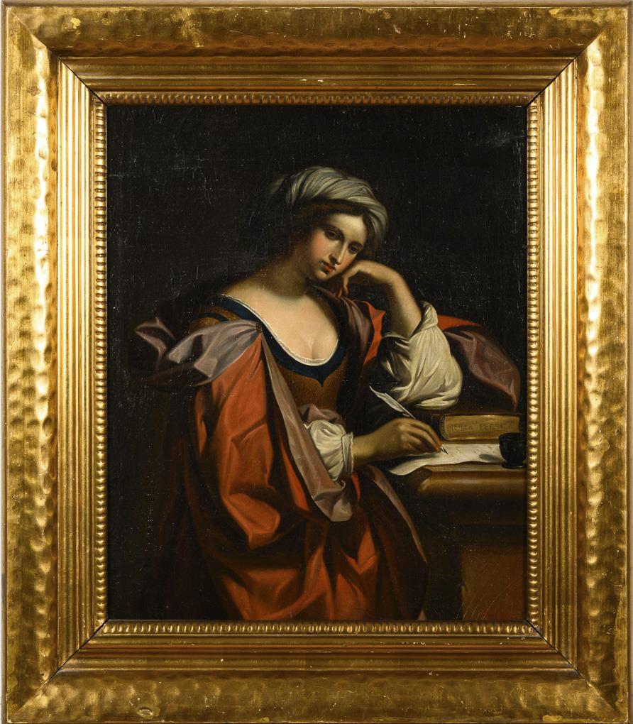 Allegorische Darstellung der Sibilla Persica in barockem Gewand an einem Pult sitzend und einen Brief schreibend. Gute Kopie nach dem barocken Original, welches 1647 entstanden und heute in den Musei Capitolini in Rom zu sehen ist. Altersspuren.