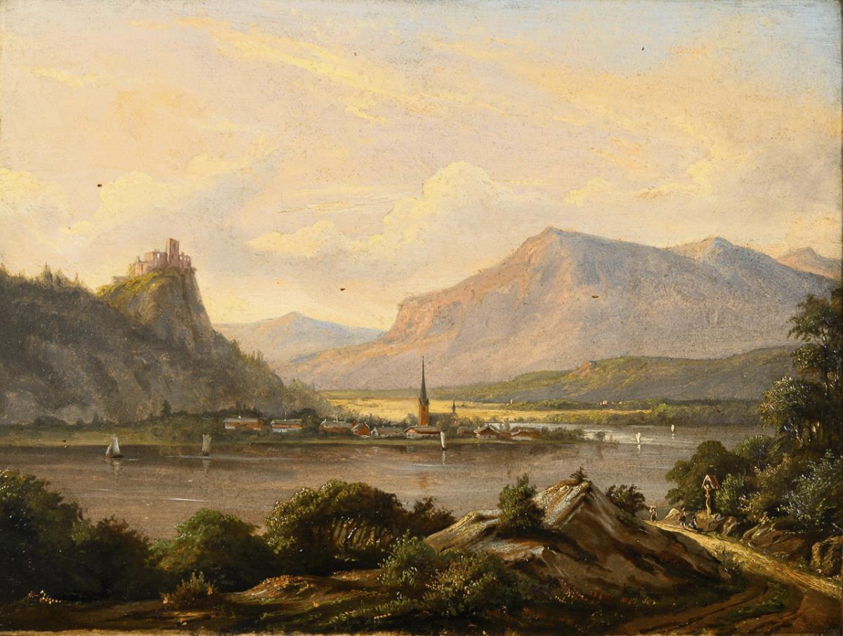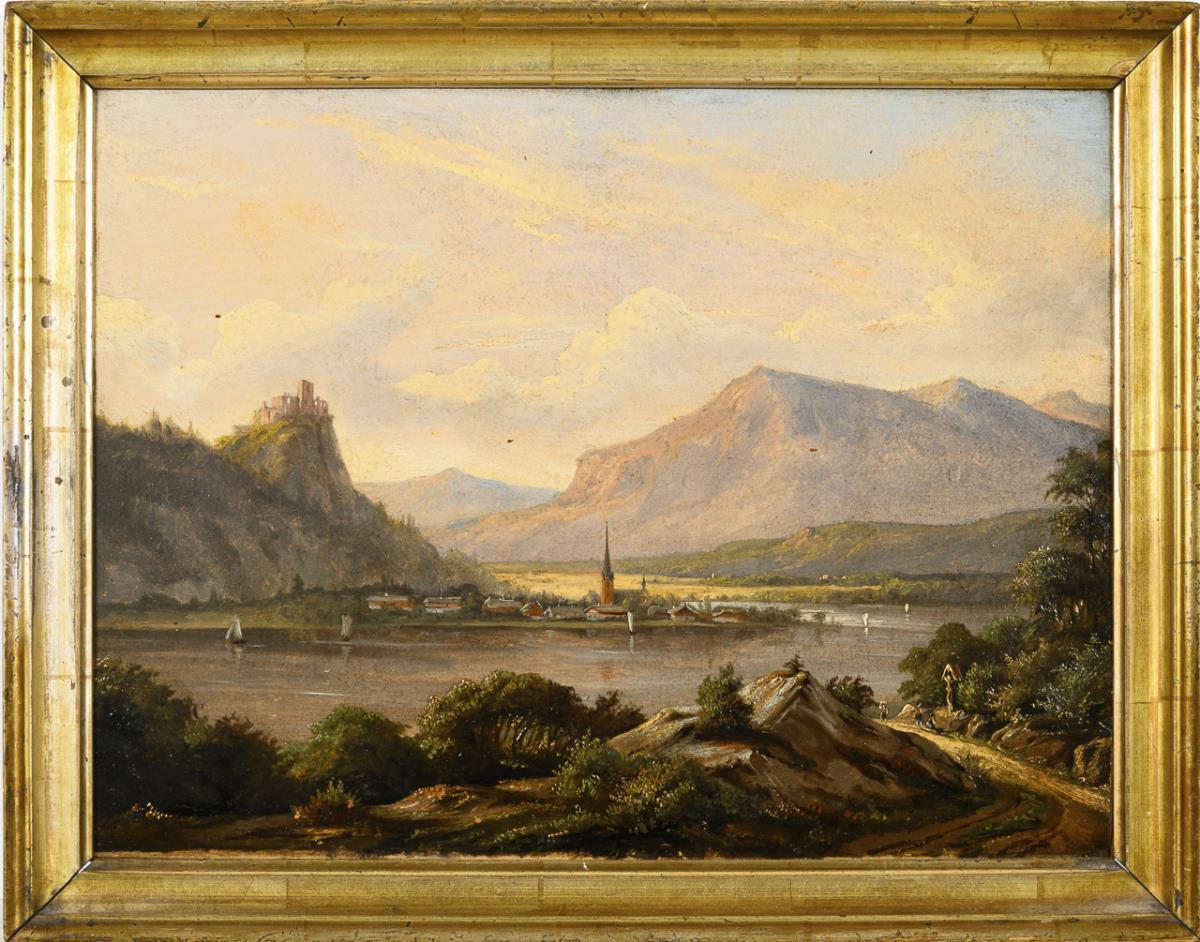 Idyllische Berglandschaft, wohl an Rhein oder Mosel, mit Ortschaft am Ufer unterhalb einer Burgruine. Altersspuren.
