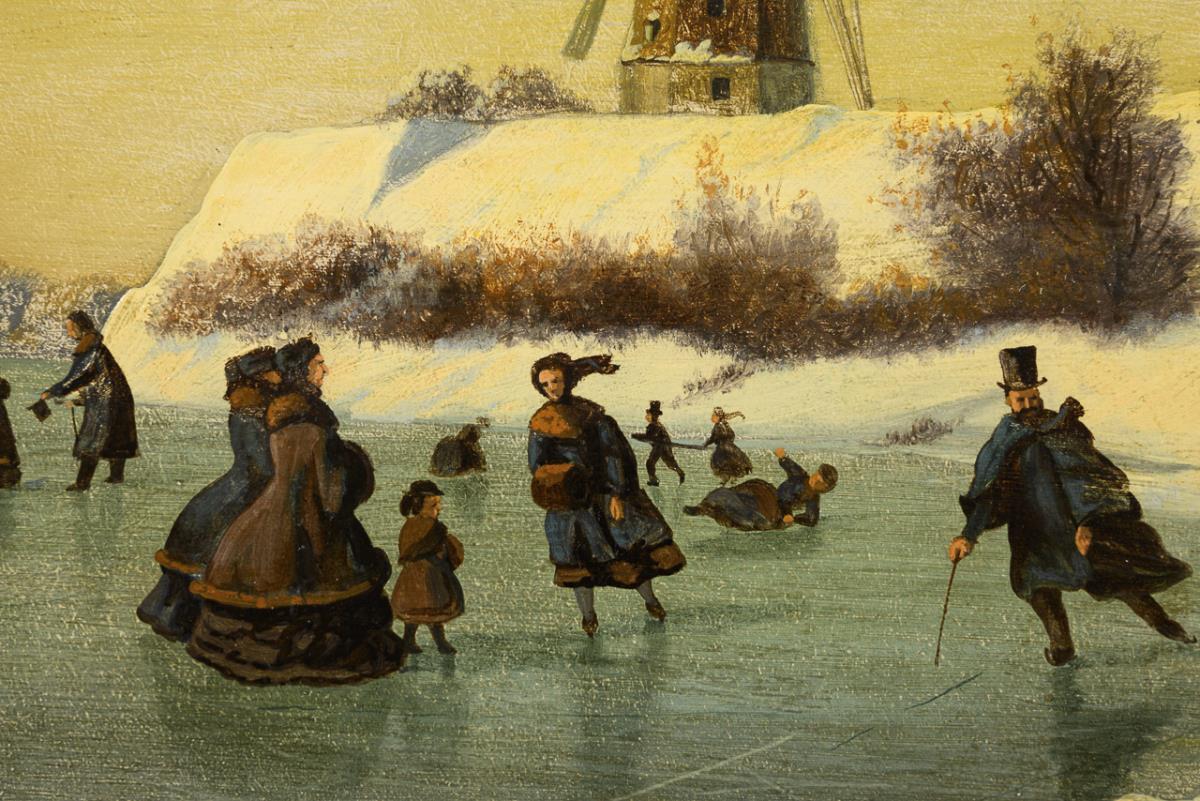 Fischerhäuser am schneebedeckten Ufer bei tief stehender Sonne sowie Eisvergnügen nahe der Windmühle auf dem Fluss.