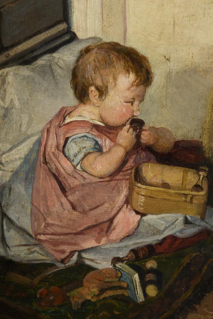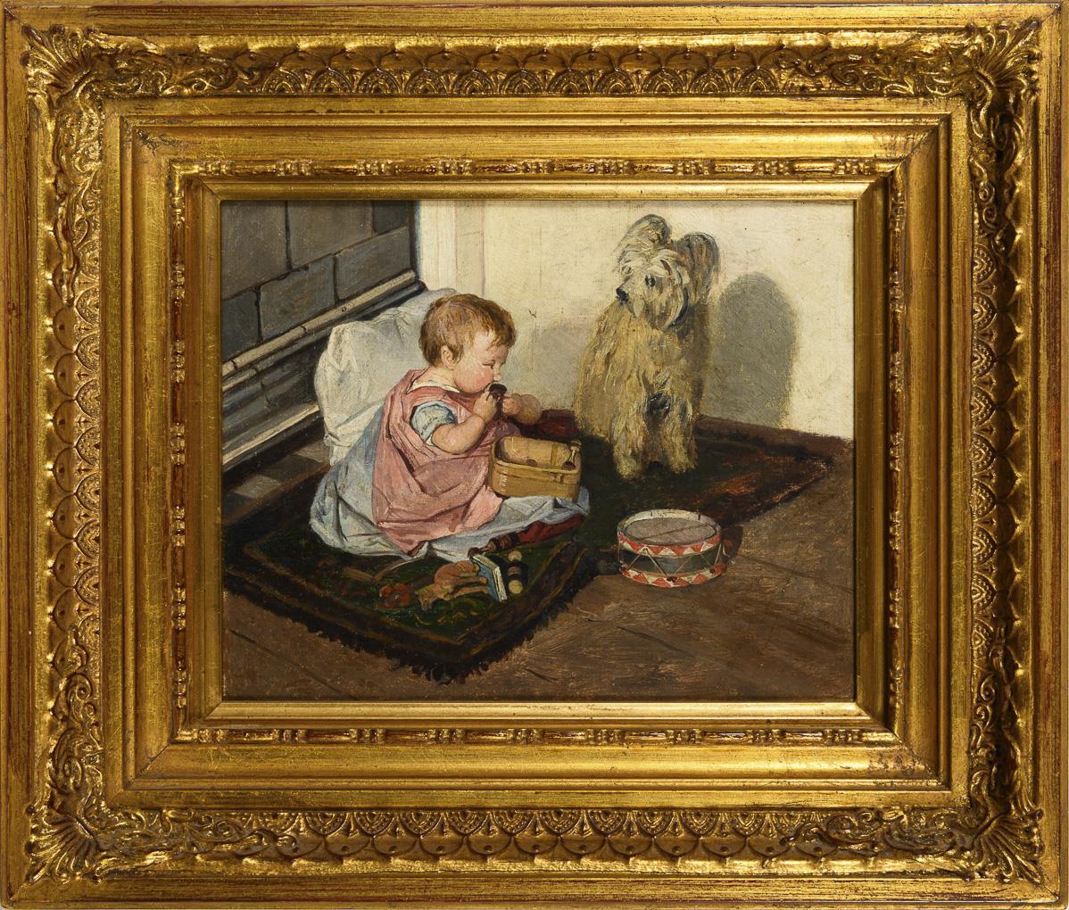 Das Kleinkind auf einem Teppich mit dem Spielzeug und dem Hund daneben. Leichte Altersspuren.