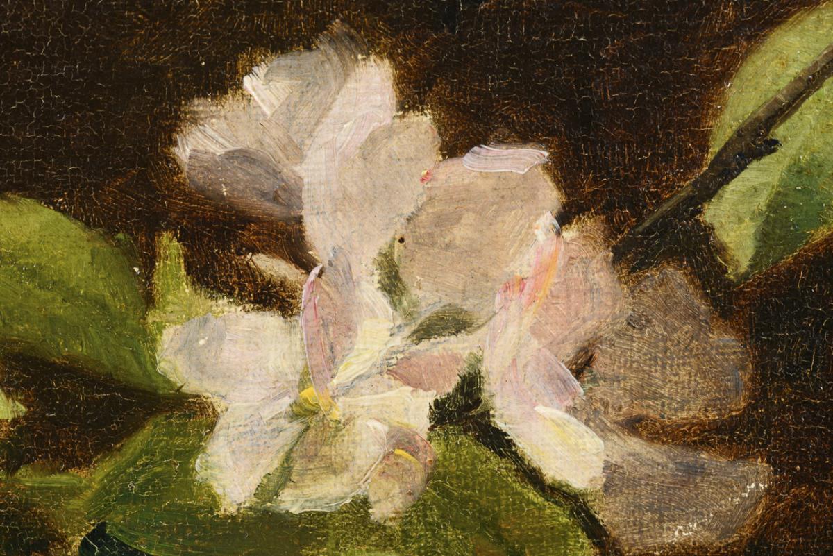 Schmaler Zweig mit saftig grünen Blättern und hellen geöffneten Blüten vor dunklem Hintergrund. Eine kleine restaurierte Stelle.