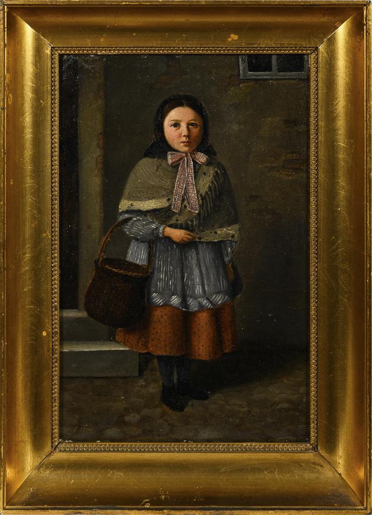 Mädchen mit Kopftuch und Korb vor einem Hauseingang. Altersspuren.