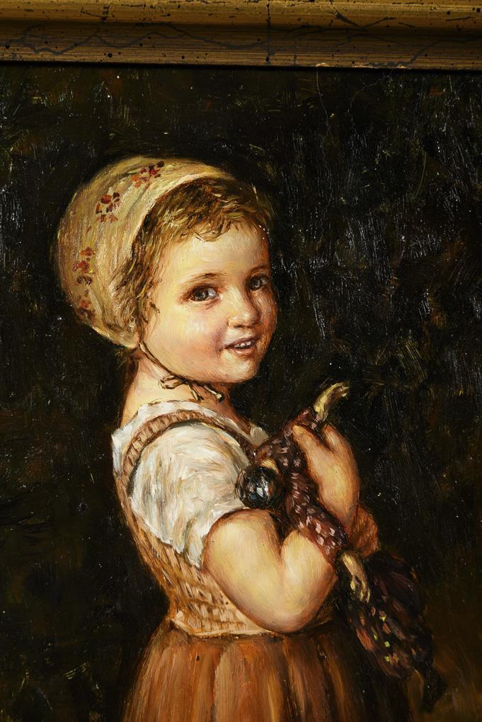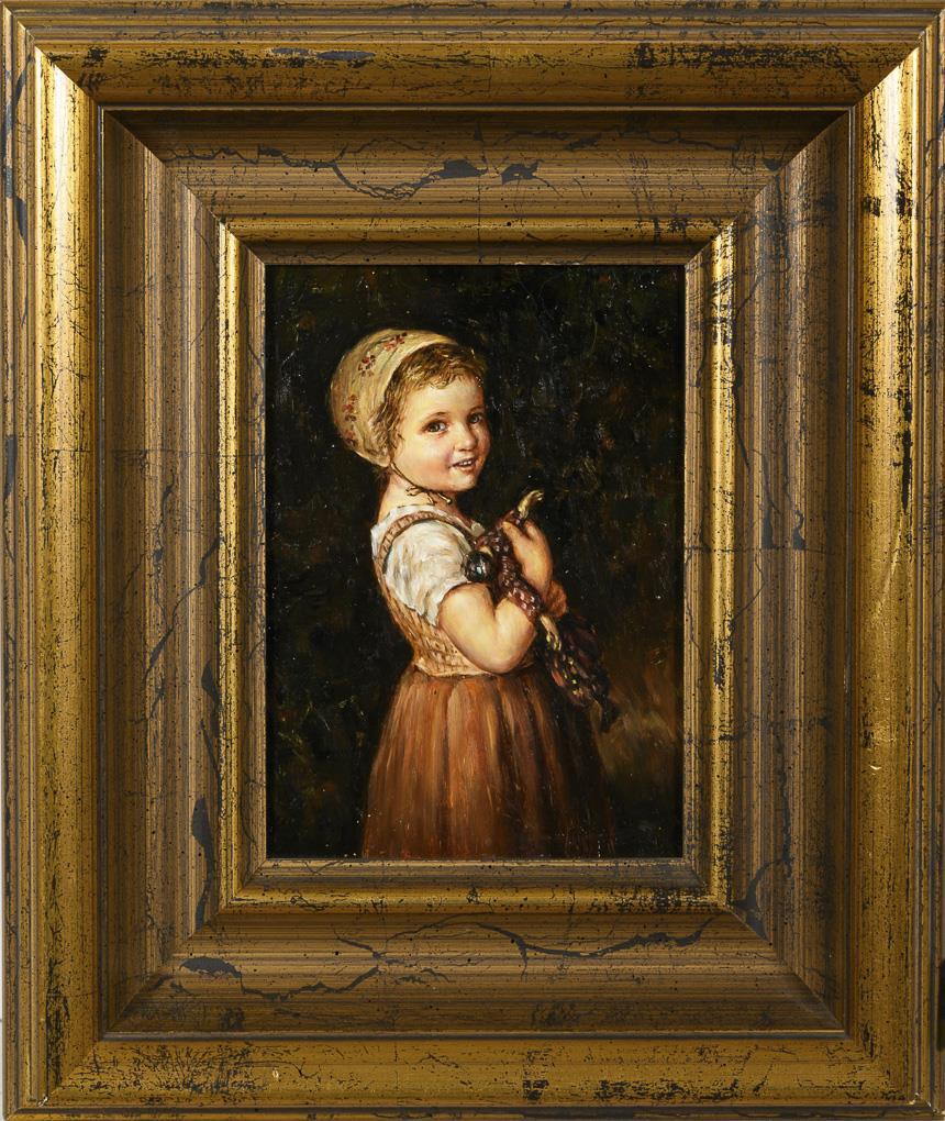 Bildnis eines lachenden Mädchens mit Harlekin-Puppe in den Händen.