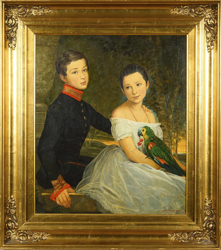 Junger Mann in Uniform neben Mädchen in weißem Kleid mit dem Paradiesvogel auf dem Arm.