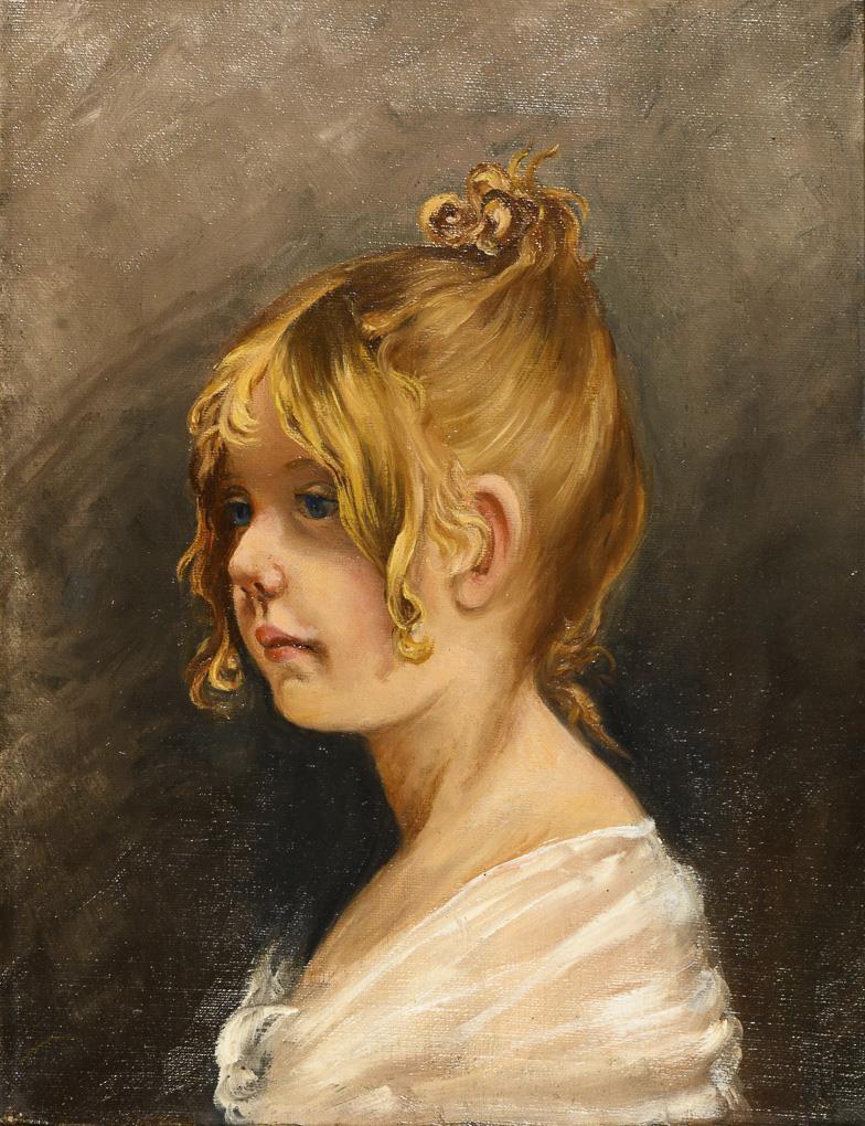Dreiviertelporträt eines Mädchens mit blondem Haar und in weißem Gewand.