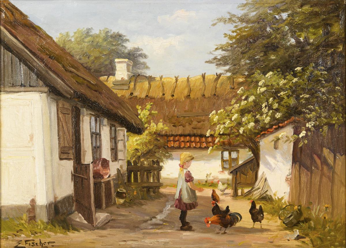 Das Kind mit dem Geflügel im sonnigen Hof.