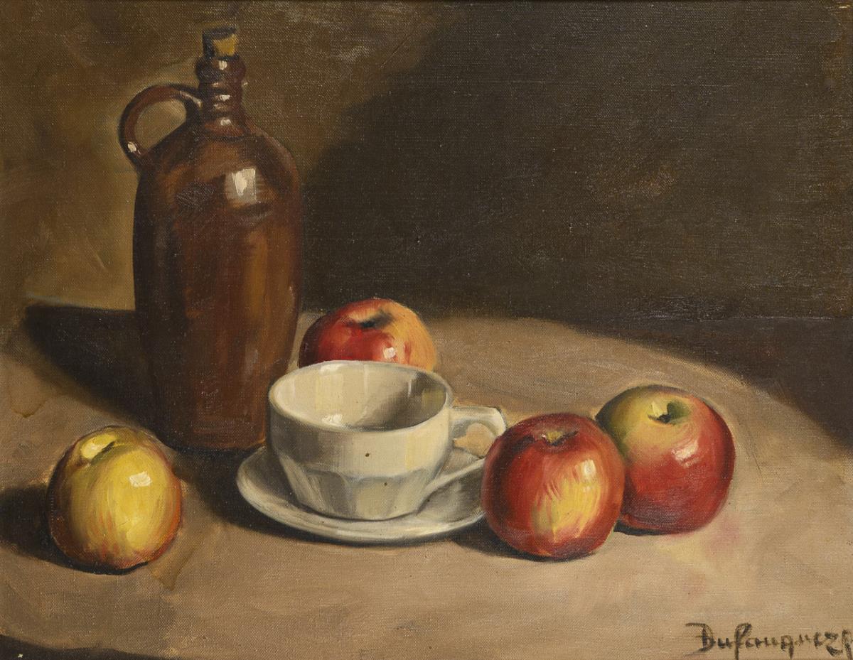 Undeutlich signiert: Stillleben mit Äpfeln, Krug und Tasse