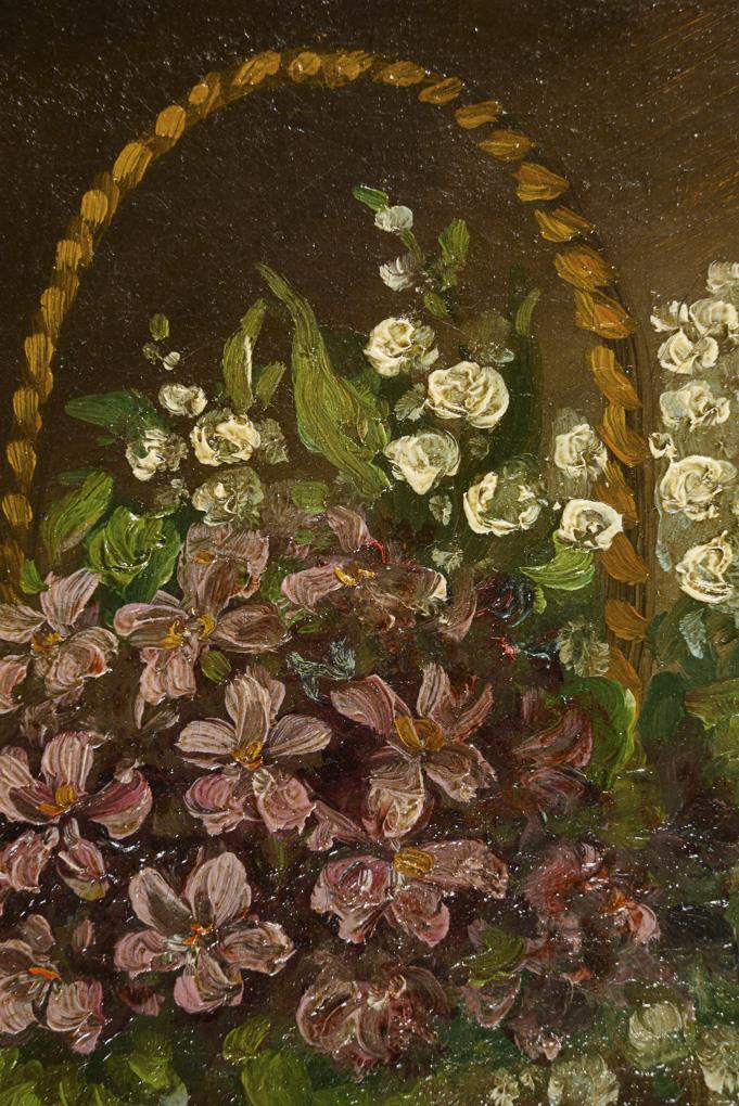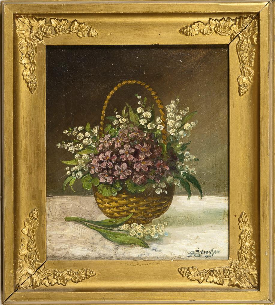 Stillleben mit Maiglöckchen und Veilchen im Korb.