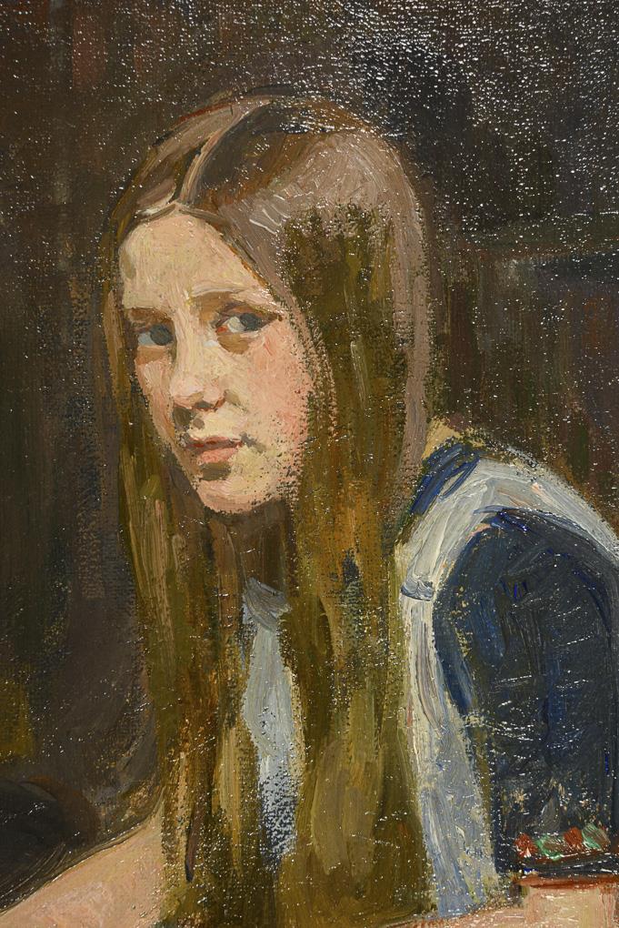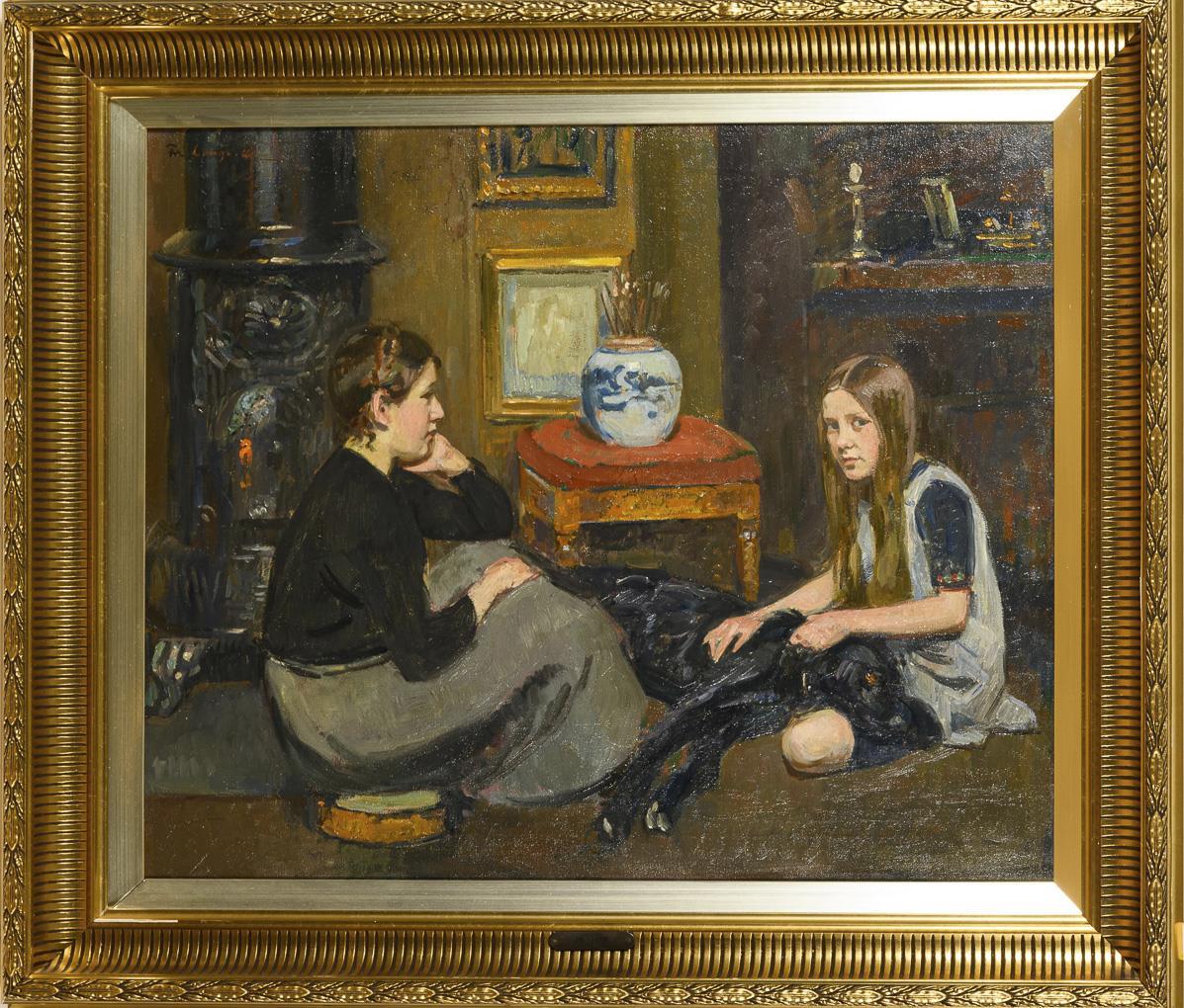 Die zwei Kinder mit dem schwarzen Hund neben einem Ofen und einem Hocker mit Pinseln in einer Vase.