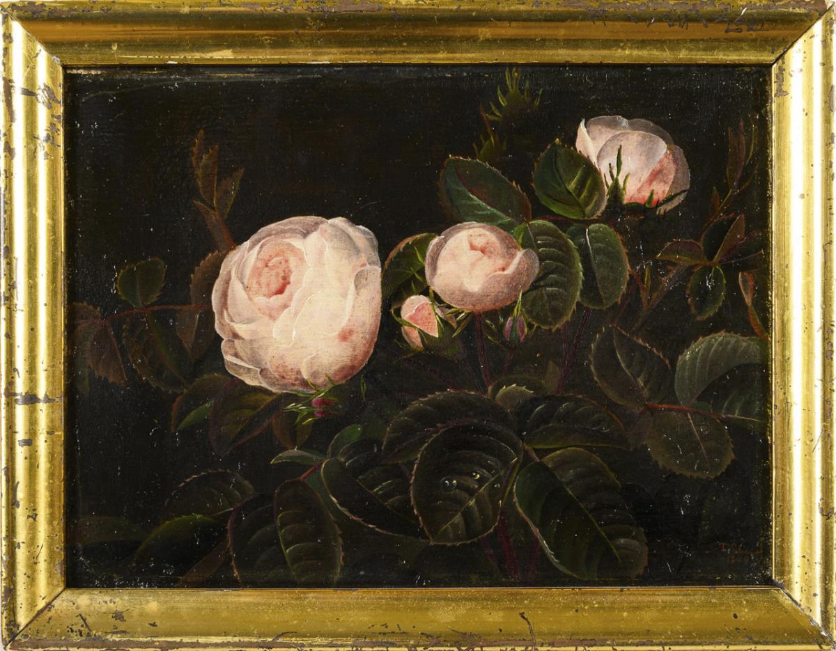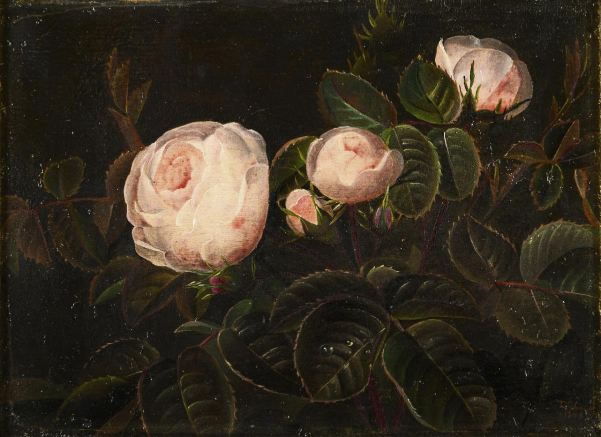 Rosenzweig mit drei sich öffnenden Blüten vor dunklem Hintergrund.