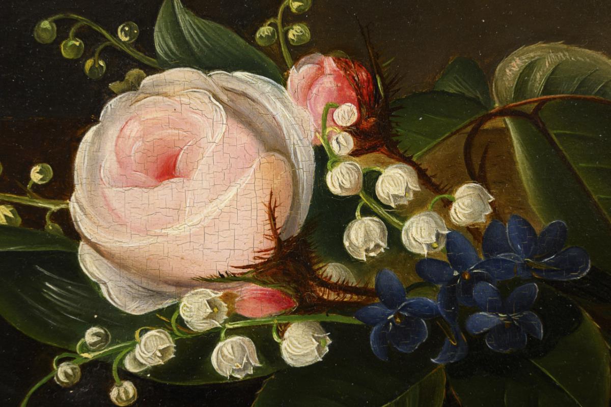 Hellrote Rosen mit Veilchen und Maiglöckchen. Leichte Altersspuren.
