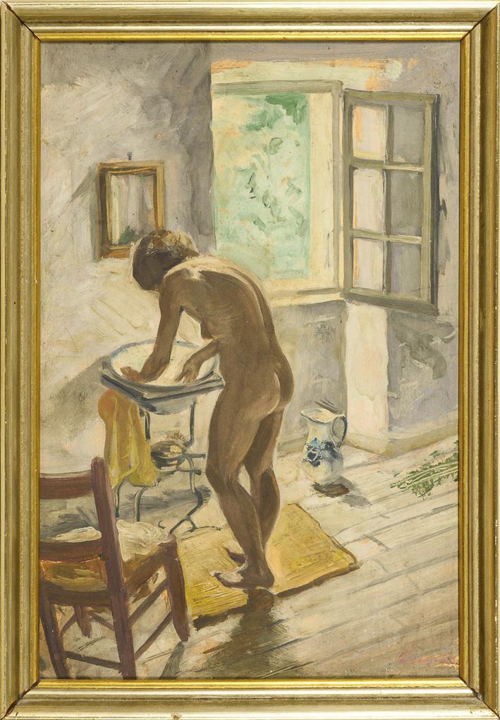 Über die Waschschüssel gebeugte, nackte Frau bei geöffnetem Fenster und einfallendem Licht. Leichte Altersspuren.