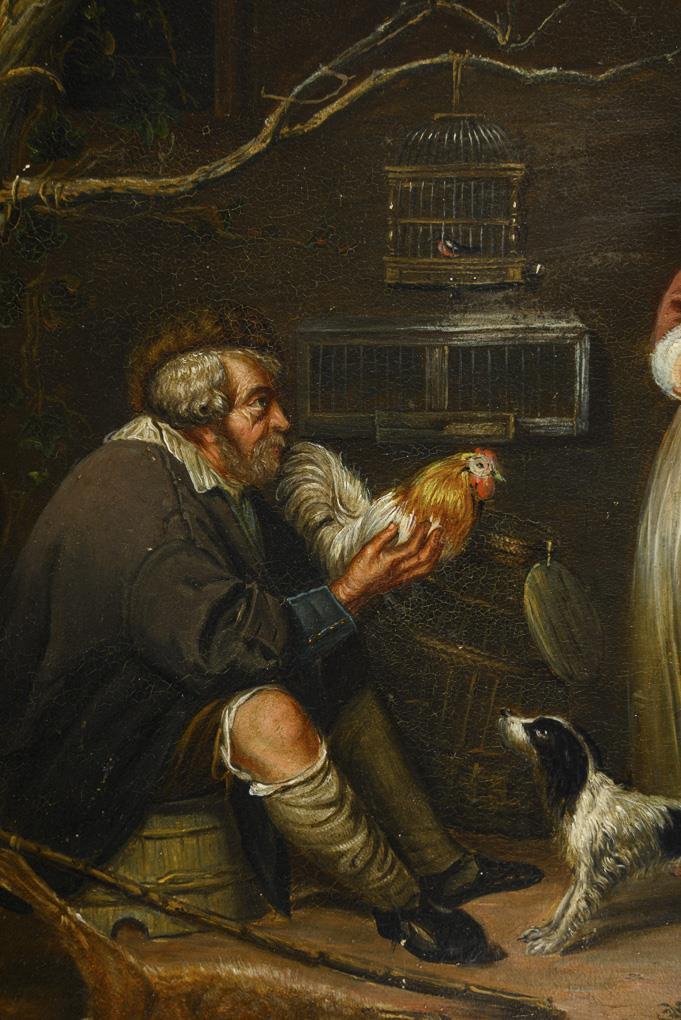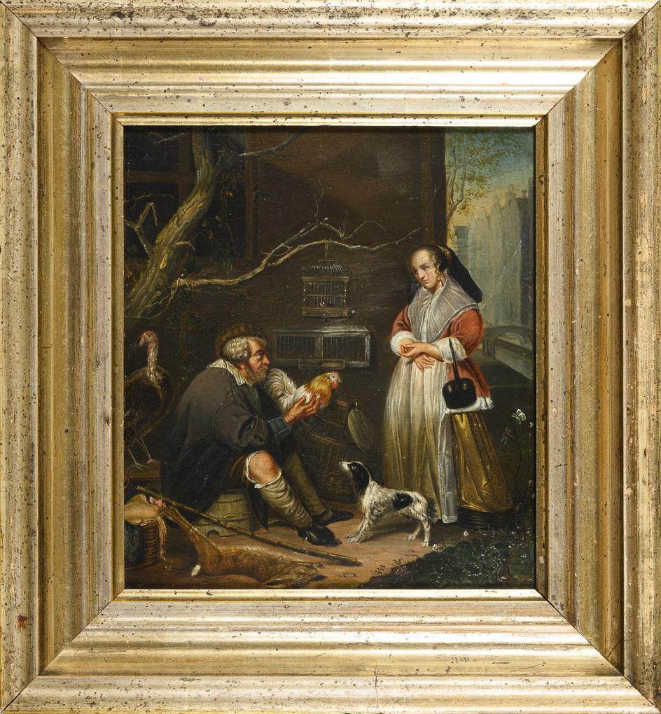 Im Stil des 17. Jahrhunderts gemalter Genreszene mit einem Viehhändler im Gespräch mit einer Kundin.