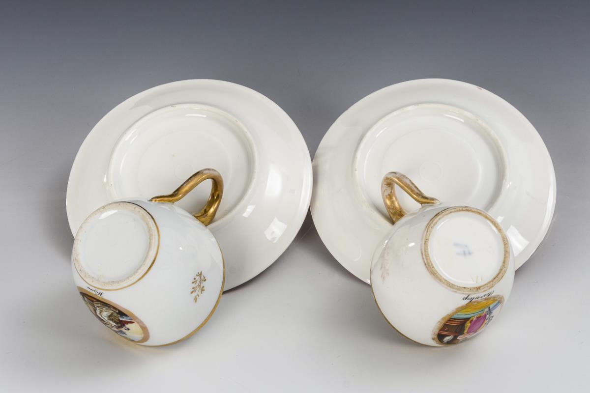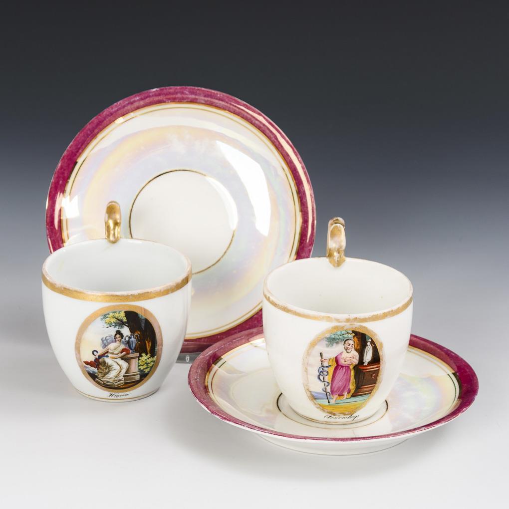 Campanertassen mit Schwanenhenkel. Schauseitig jeweils ein goldgerahmtes Ovalmedaillon mit der bezeichneten Darstellung der Heilgottheiten Hygeia und Aesculap. 1 Tasse mit Haarriss am oberen Henkelansatz.