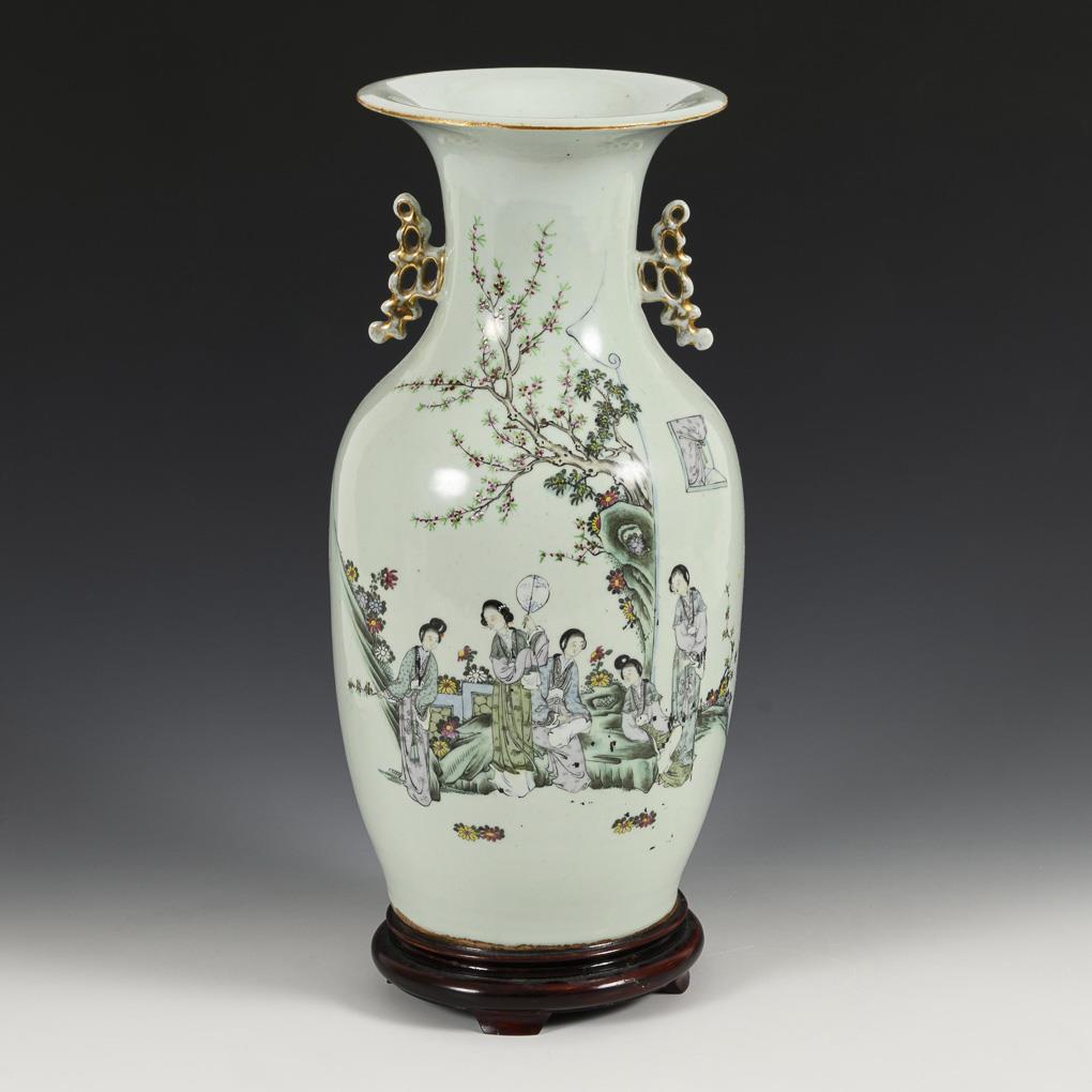 Balustervase mit polychromer Emailmalerei. Fünf Damen im blühenden Garten unter knospendem Baum. Rückseite mit zwei Schriftblöcken. Seitlich zwei durchbrochen gearbeitete Handhaben mit beriebener Vergoldung. Oberster Rand mit dünner, brauner Kante. Holzsockel.