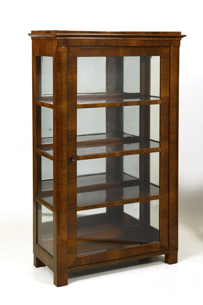 Schlichter 1-türiger, 3-seitig versprosst-verglaster Vitrinenschrank mit verspiegelter Rückwand; innen 3 Einlegeböden. Alters-/Gebrauchsspuren, Furnier mit kleinen Defekten, restauriert mit Ergänzungen.