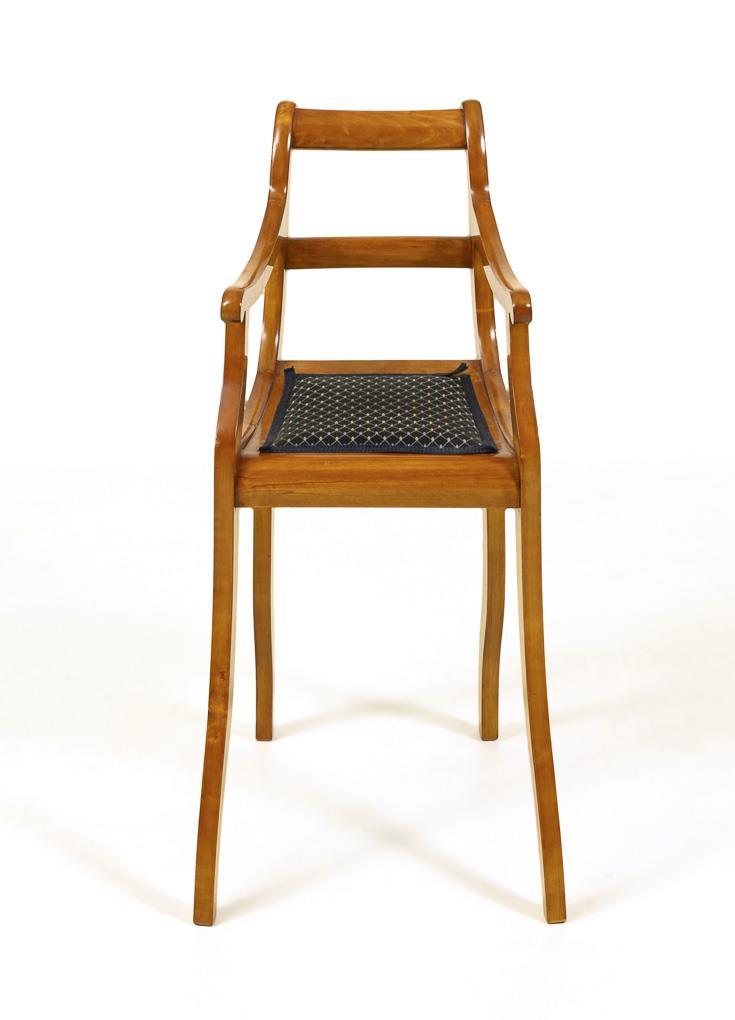 Zierlicher Hochstuhl für Kleinkinder auf 4 ausgestellten Beinen, Rückenlehne und Armlehnen, gepolsterte Sitzfläche mit dunkelblauem Bezug und Rautendekor. Furnier mit minimalen Defekten, restauriert, Polster und Bezug ergänzt.