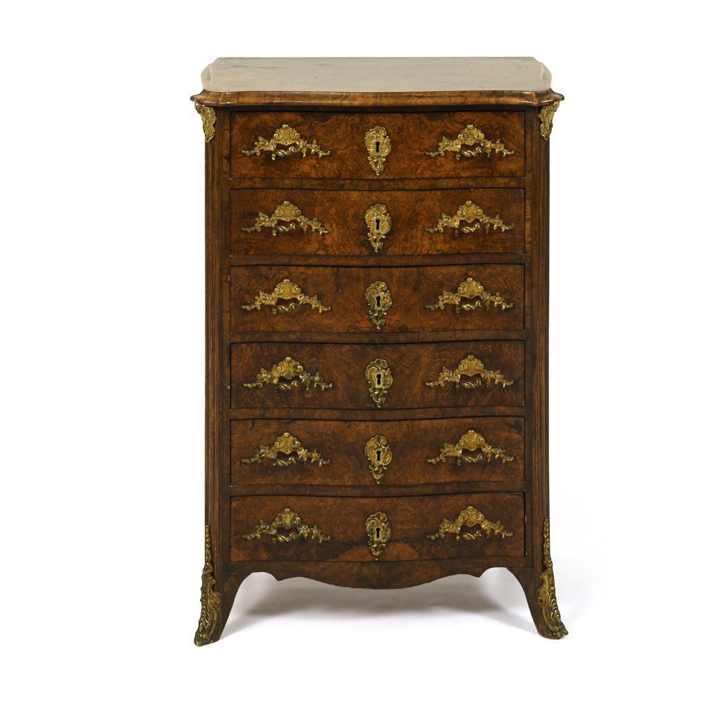 Elegante, 6-schübige Pfeilerkommode auf 4 leicht ausgestellten Füßen; verziert mit gespiegeltem Maserfurnier und stiltypischen Bronzebeschlägen. Restauriert, leichte Alters-/Gebrauchsspuren.