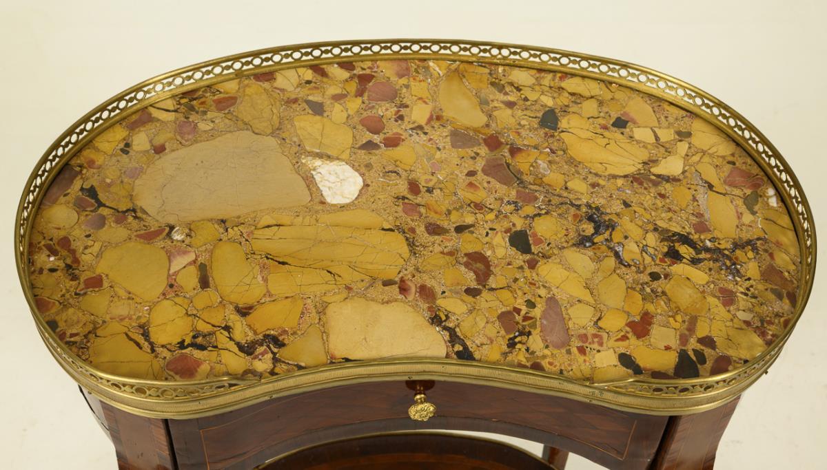 Nierenförmiger Beistelltisch im Transition-Stil auf 4 leicht geschwungenen Beinen, mit Sockelablage, Zargenschub und gelb-rot-blauer Marmorplatte (Brèche Jaune); verziert mit Rautenmarketerie, Messinggalerie und -applikationen. Alters-/Gebrauchsspuren, Furnier teils geklebt, Furnier mit kleinen Defekten.