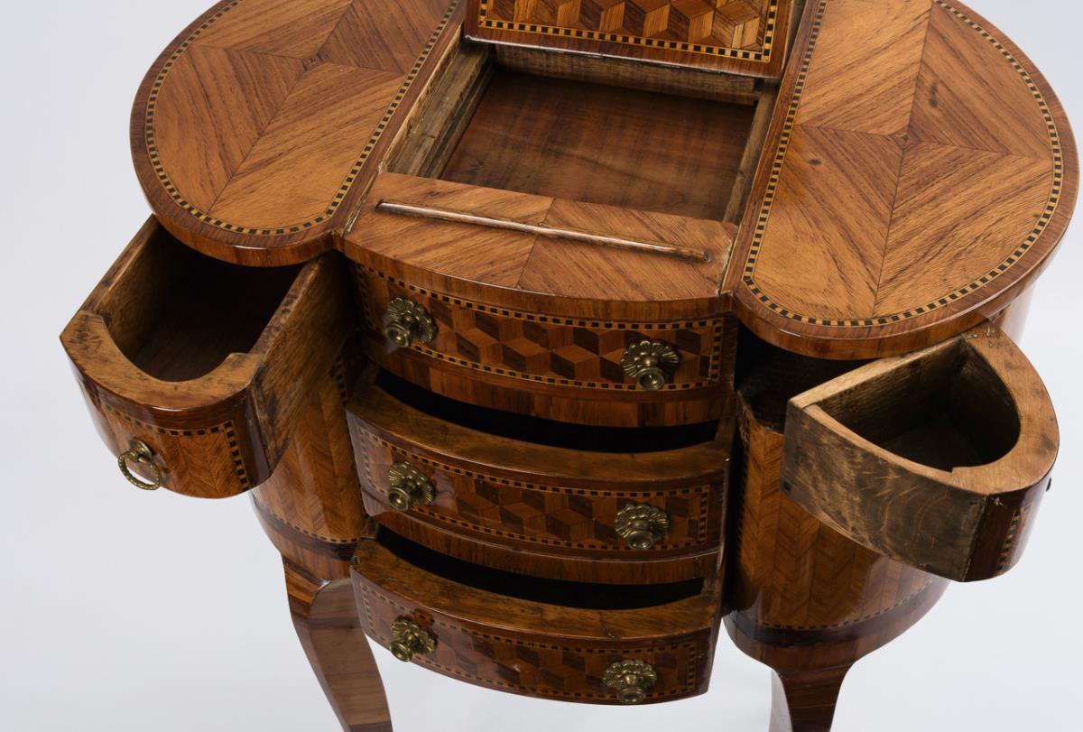 Raffiniertes, nierenförmiges Damenmöbel auf 4 Säbelbeinen mit aufstellbarem Lese- oder Schreibpult, 2 seitlichen kleinen Fächern für Utensilien und 2 kleinen mittleren Schüben, 2 verborgene Geheimfächer hinter den Schüben, Deckplatte mit integriertem Fach unter der Pultplatte; reich verziert mit Würfelmarketerie und allseitiger Fischgrätmarketerie. Alters-/Gebrauchsspuren, Trockenrisse, Furnier mit minimalen Retuschen.