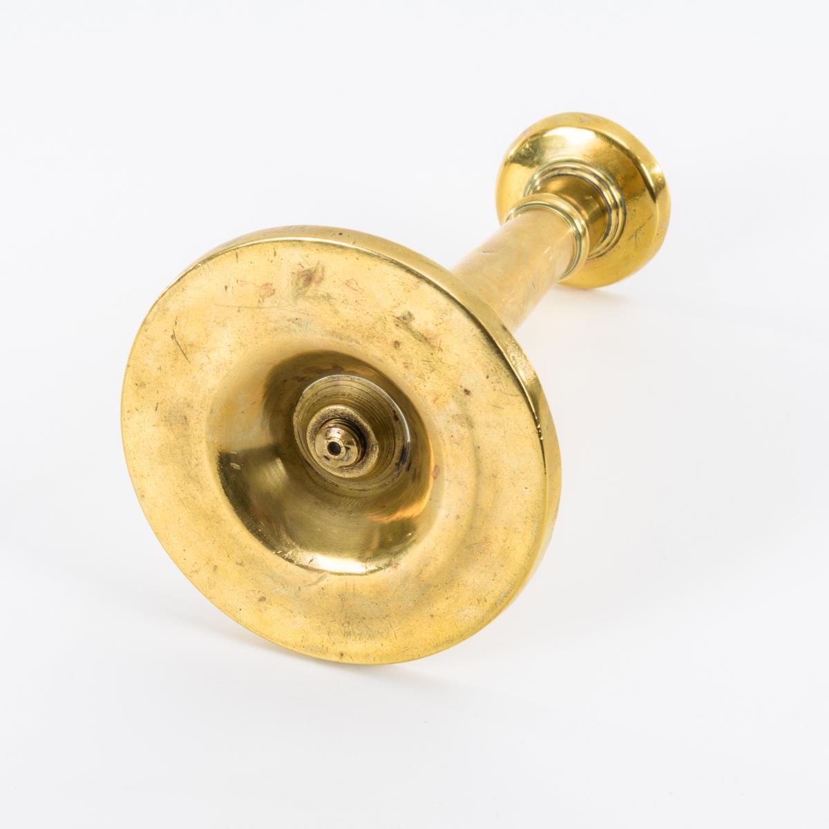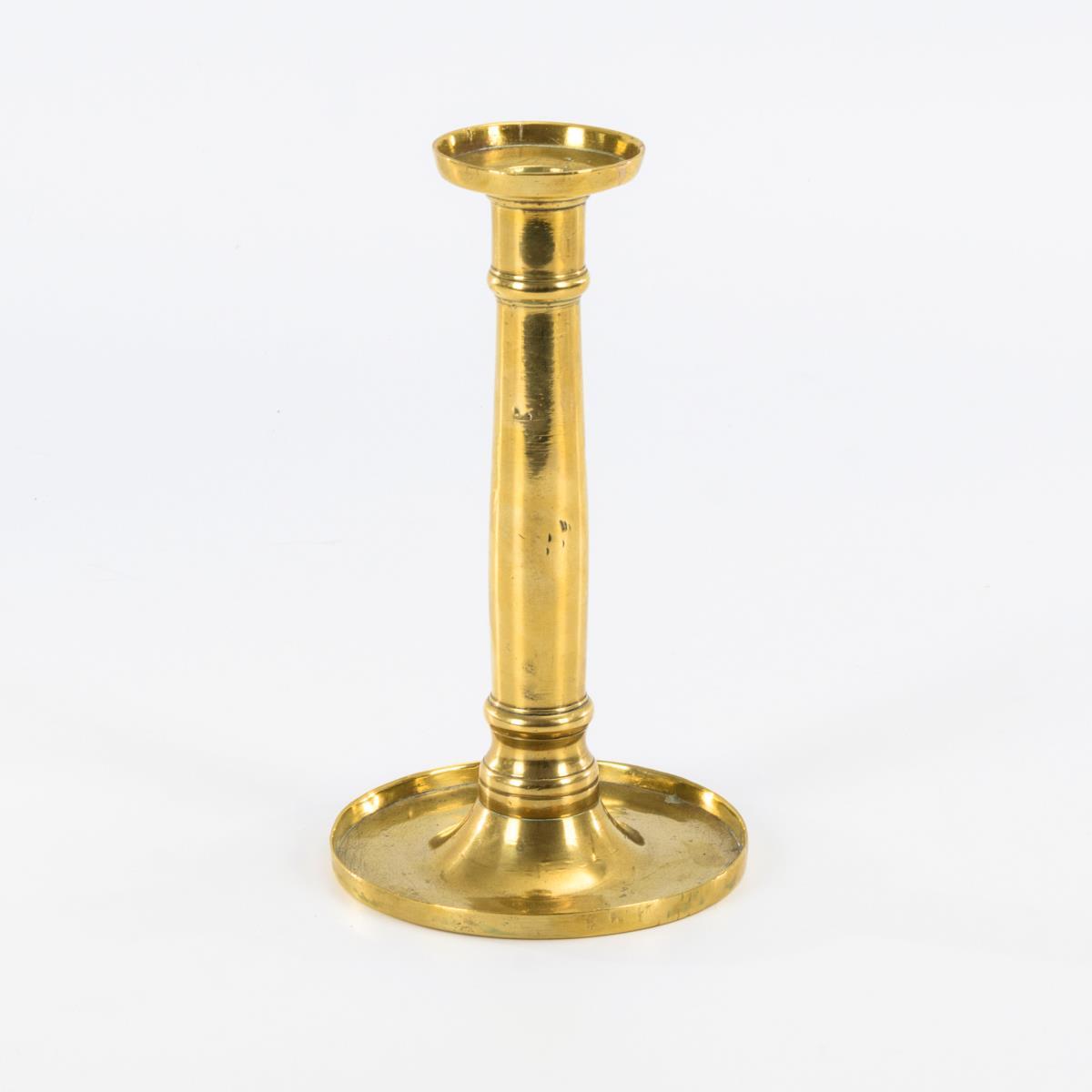1-flammiger Bronzeleuchter mit Schalenfuß und Säulenschaft. Alters-/Gebrauchsspuren, minimale Lötstellen am Wachsteller.