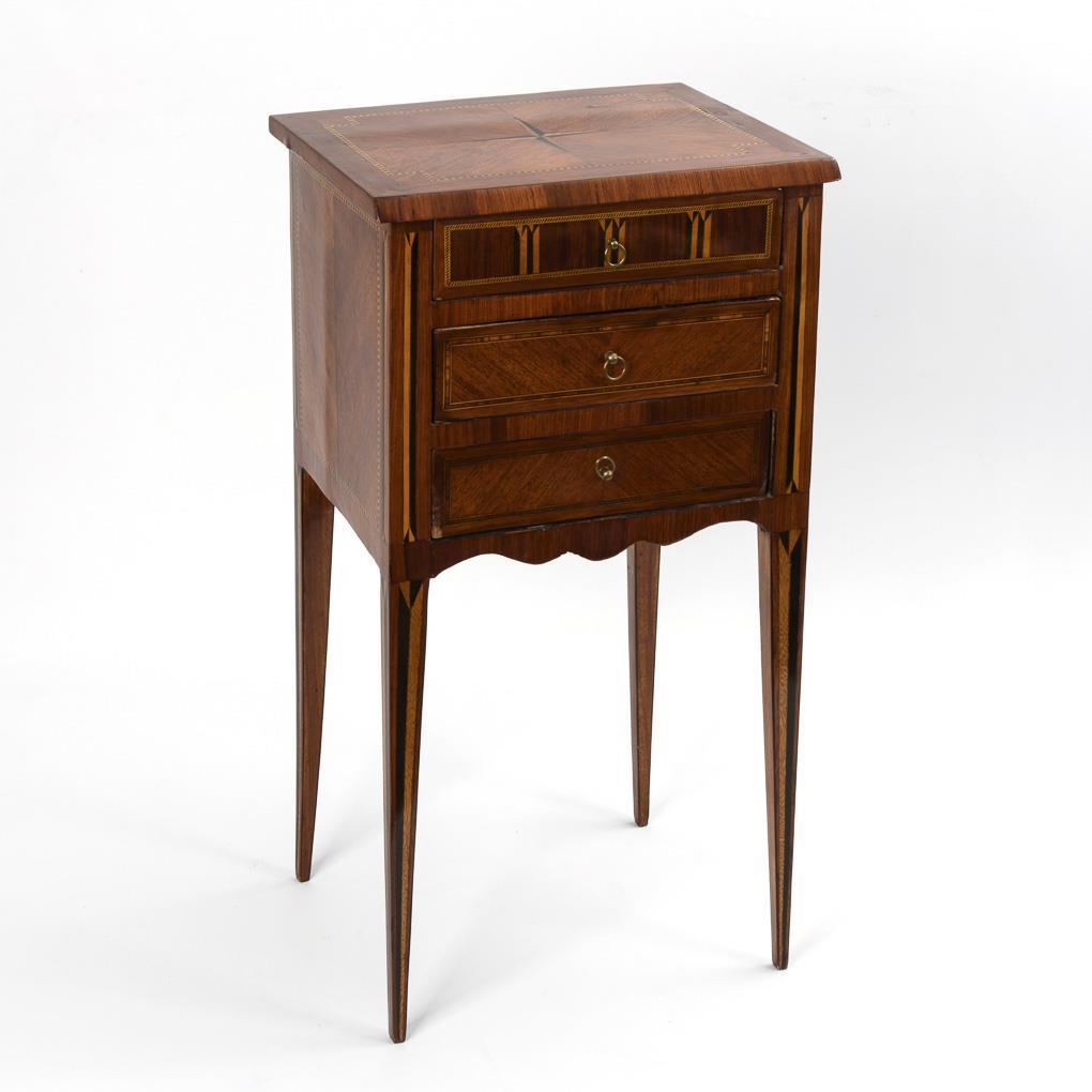 Kleine Louis-Seize-Kommode mit 3 Schüben und 4 sich verjüngenden Pfeilerbeinen; verziert mit gespiegeltem Rosenholzfurnier und teils ebonisierten Bandintarsien, Rückwand verziert mit Maserfurnier. Restauriert, Alters-/Gebrauchsspuren, Furnier teils gewellt.