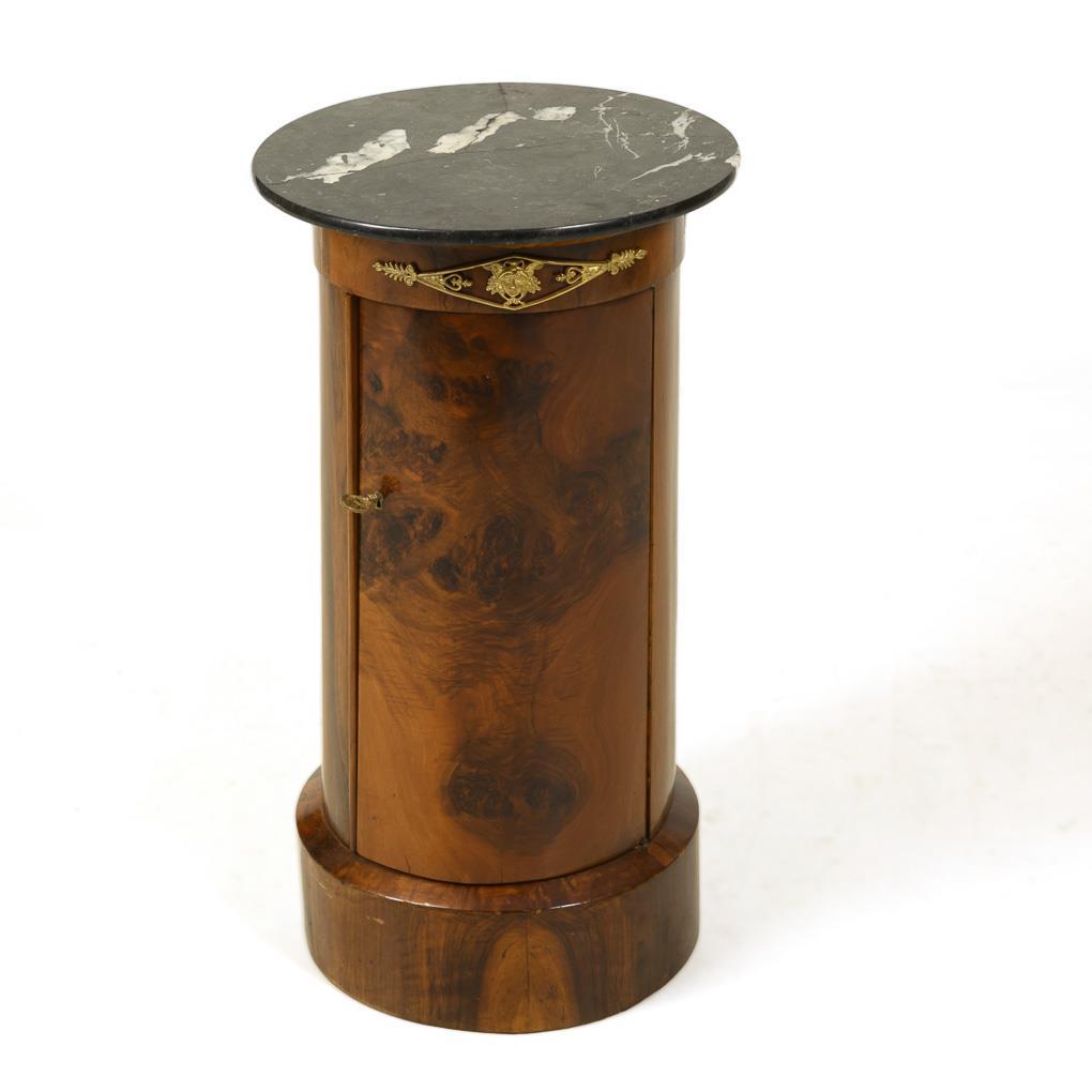 1-türiges Pfeiler-Trommelschränkchen mit rundem Korpus, Deckplatte aus schwarzem, weiß geadertem Marmor, dezent verziert mit antikisierender Messingapplikation; innen 2 Einlegeböden. Alters-/Gebrauchsspuren, Furnier mit kleinen Ergänzungen, Schloss ergänzt, Platte geklebt, 2004 Thermo Lignum-Behandlung gegen Schädlinge.