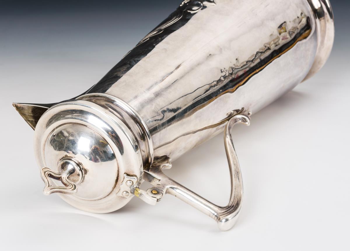 Konische Kanne mit stilisiert vegetabil reliefierter Kartusche unter der Schnaupe. Scharnier gelötet, sonst kaum Alters-/Gebrauchsspuren.